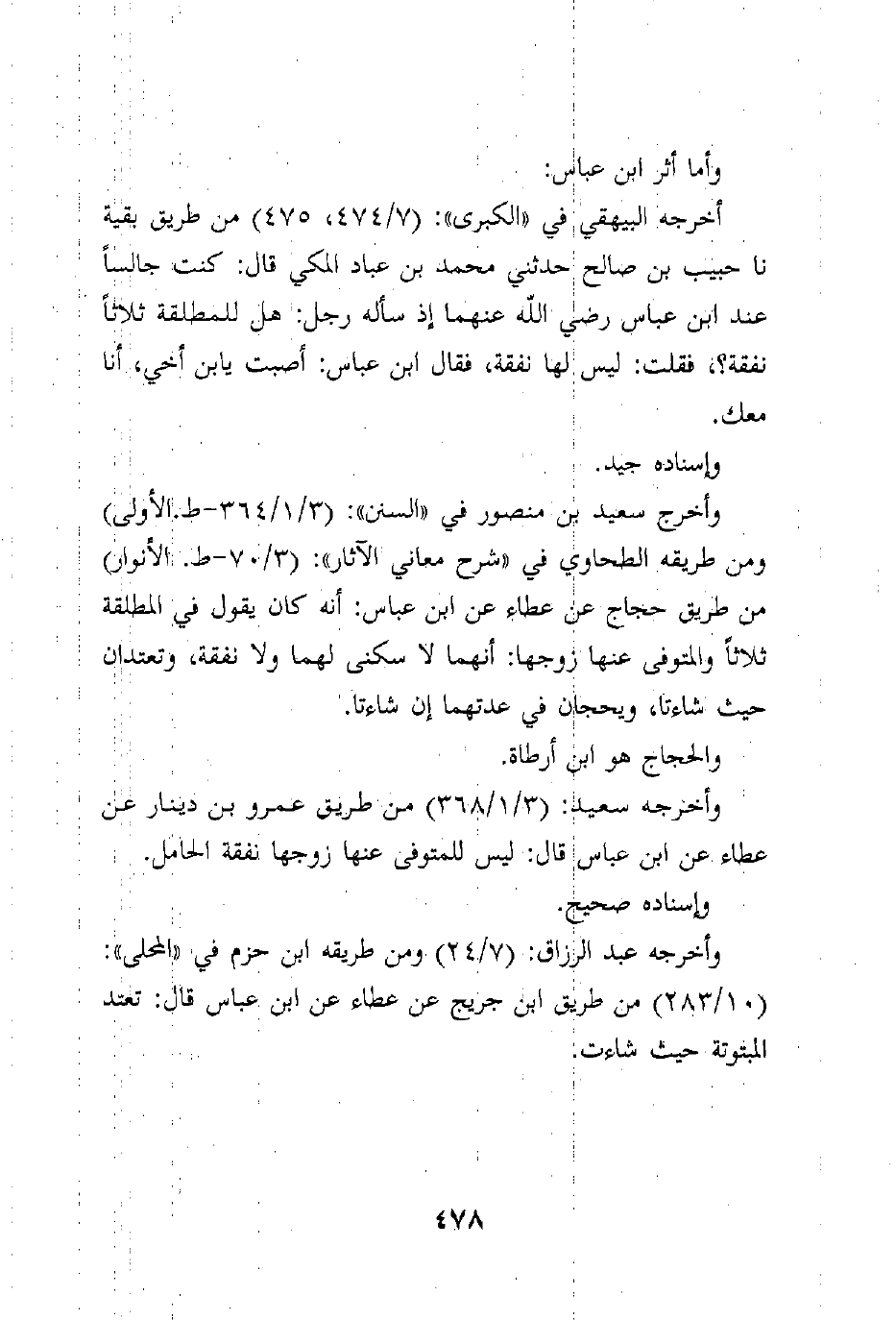 وأخرج سعيد بن منصور في "السنن": (3/1/364 - ط. الأولى) ومن طريقه الطحاوي في "شرح معاني الآثار": (3/70 - ط. الأنوار) من طريق حجاج عن عطاء عن ابن عباس: أنه كان يقول في المطلقة ثلاثاً والمتوفى عنها زوجها: أنهما لا سكنى لهما ولا نفقة، وتعتدان حيث شاءتا، ويحجان في عدتهما إن شاءتا.