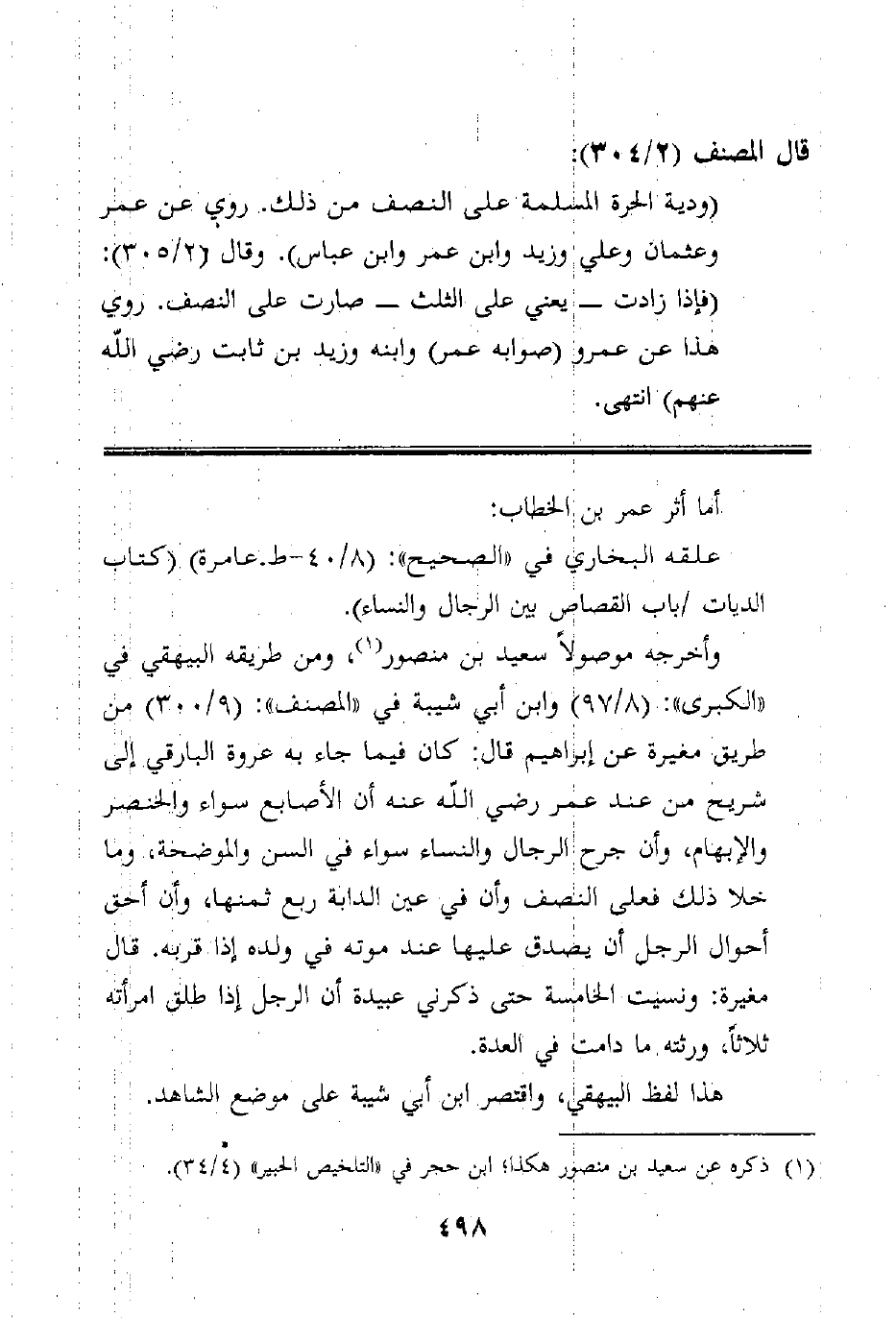 (ودية الحرة المسلمة على النصف من ذلك. روي عن عمر وعثمان وعلي وزيد وابن عمر وابن عباس) . وقال (2/305) : (فإذا زادت _ يعني على الثلث _ صارت على النصف. روي هذا عن عمرو (صوابه عمر) وابنه وزيد بن ثابت رضي الله عنهم) انتهى.