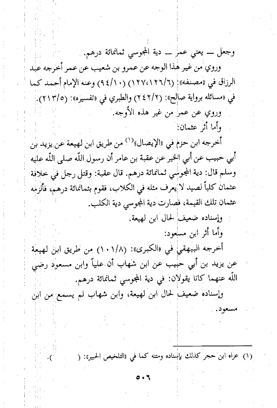 فأخرجه البيهقي في "الكبرى": (8/101) من طريق ابن وهب عن ابن لهيعة عن يزيد بن أبي حبيب عن ابن شهاب أن علياً وابن مسعود رضي الله عنهما كانا يقولان: في دية المجوسي ثمانمائة درهم.