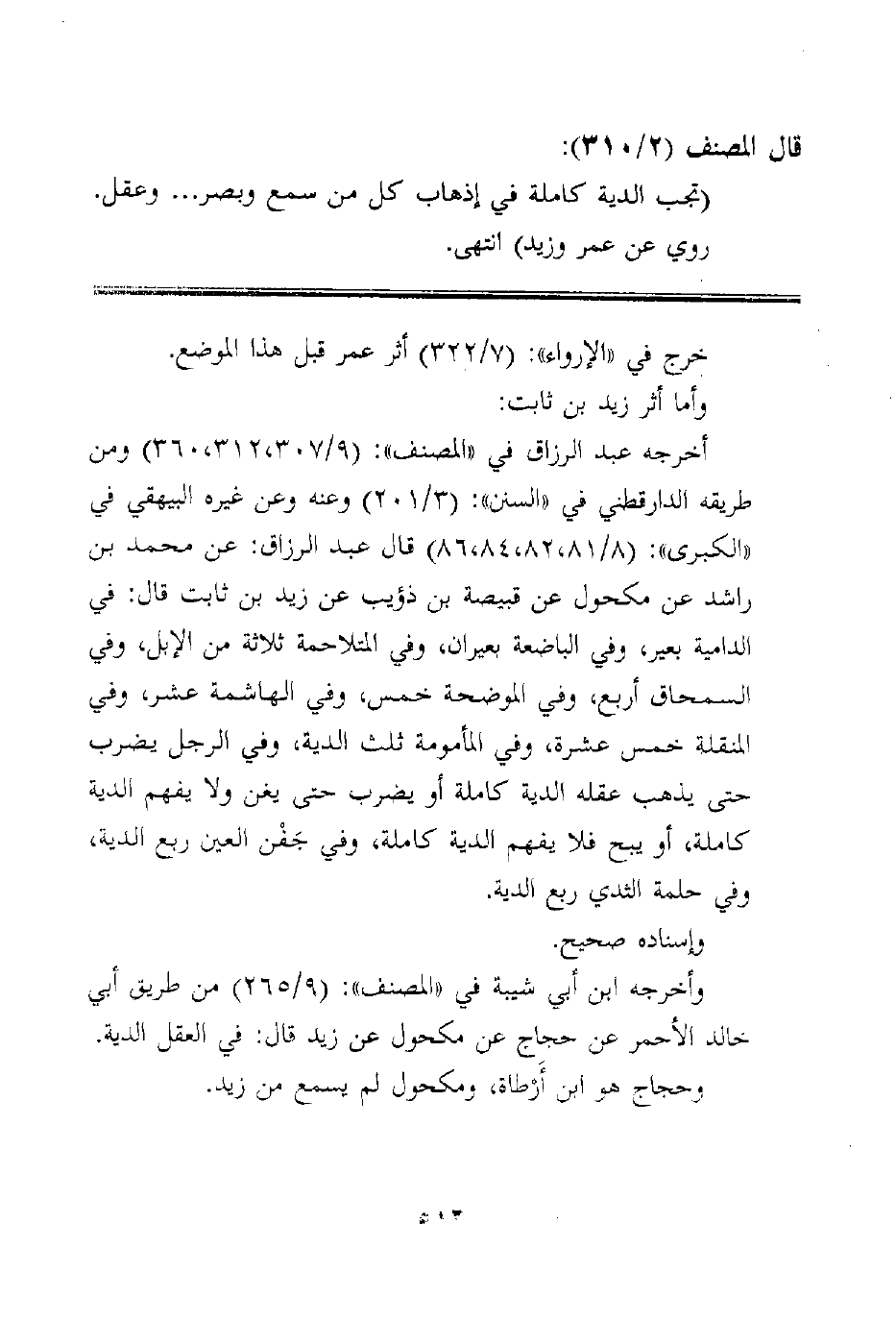 فأخرجه عبد الرزاق في "المصنف": (9/307، 312، 360) ومن طريقه الدارقطني في "السنن": (3/201) وعنه وعن غيره البيهقي في "الكبرى": (8/81، 82، 84، 86) قال عبد الرزاق: عن محمد بن راشد عن مكحول عن قبيصة بن ذؤيب عن زيد بن ثابت رضي الله عنه قال: في الدامية بعير، وفي الباضعة بعيران، وفي المتلاحمة ثلاثة من الإبل، وفي السمحاق أربع، وفي الموضحة خمس، وفي الهاشمة عشر، وفي المنقلة خمس عشرة، وفي المأمومة ثلث الدية، وفي الرجل يضرب حتى يذهب عقله الدية كاملة أو يضرب حتى يغن ولا يفهم الدية كاملة، أو يبح فلا يفهم الدية كاملة، وفي جَفْن العين ربع الدية، وفي حلمة الثدي ربع الدية.
