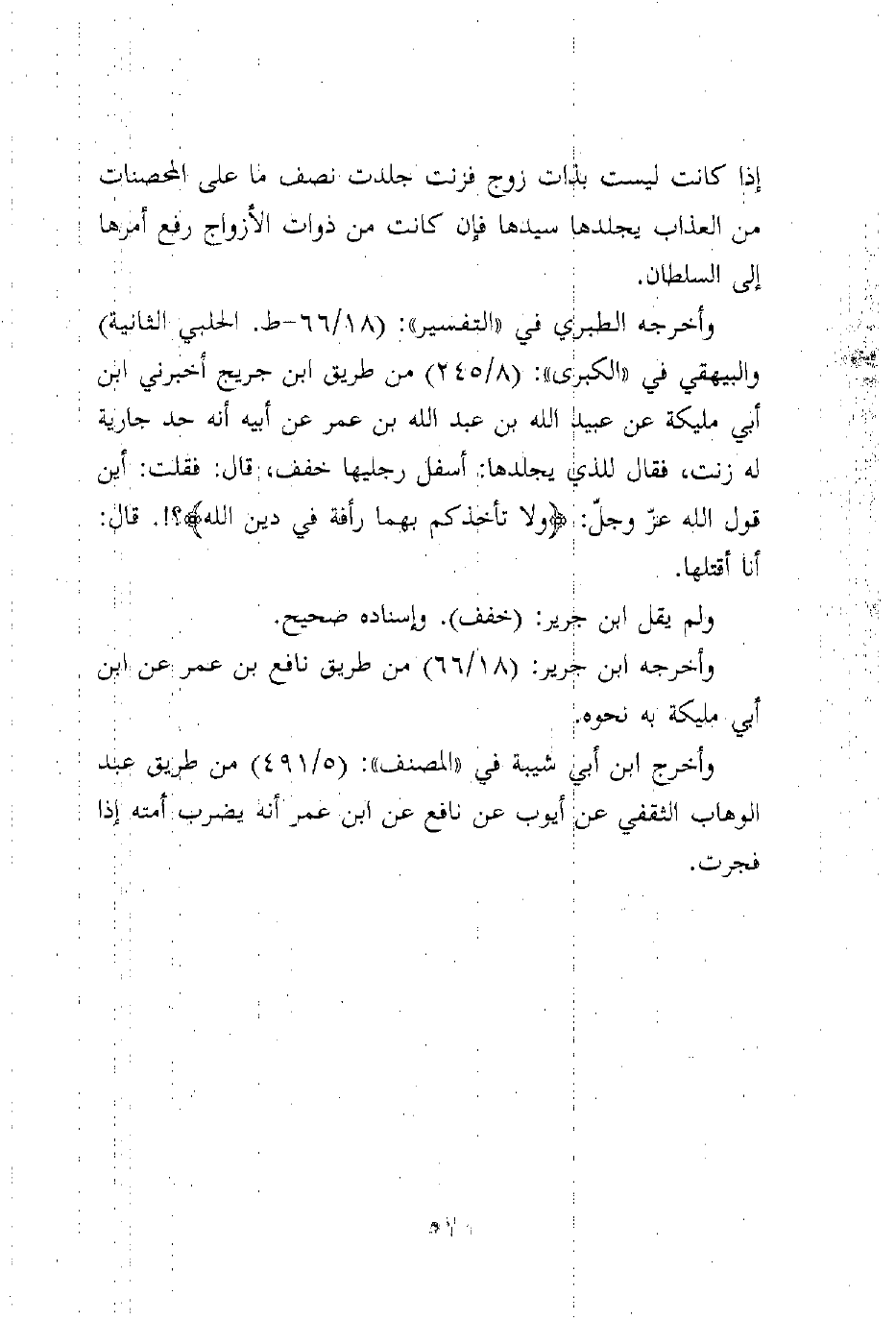وأخرجه الطبري في "التفسير": (18/66-ط. الحلبي الثانية) والبيهقي في "الكبرى": (8/245) من طريق ابن جريج أخبرني ابن أبي مليكة عن عبيد الله بن عبد الله بن عمر عن أبيه أنه حد جارية له زنت، فقال للذي يجلدها: أسفل رجليها خفف، قال: فقلت: أين قول الله عزّ وجلّ: {وَلاَ ... } [النور: 2] ؟!. قال: أنا أقتلها.