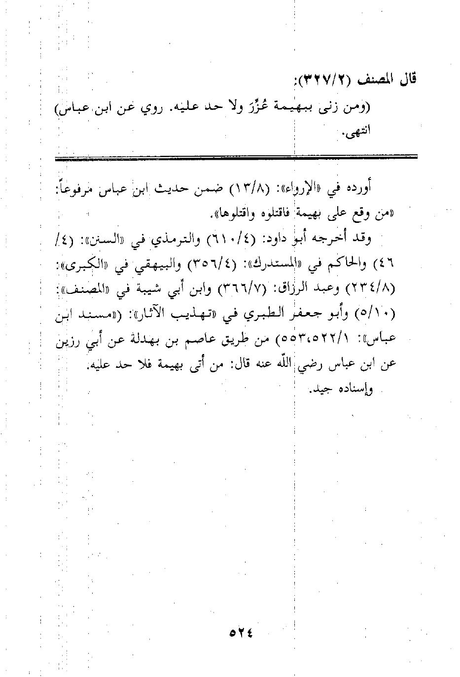 وقد أخرجه أبو داود: (4/610) والترمذي في "السنن": (4/46) والحاكم في "المستدرك": (4/356) والبيهقي في "الكبرى": (8/234) وعبد الرزاق: (7/366) وابن أبي شيبة في "المصنف": (10/5) وأبو جعفر الطبري في "تهذيب الآثار": ("مسند ابن عباس": 1/522، 553) من طريق عاصم بن بهدلة عن أبي رزين عن ابن عباس رضي الله عنه قال: من أتى بهيمة فلا حد عليه.
