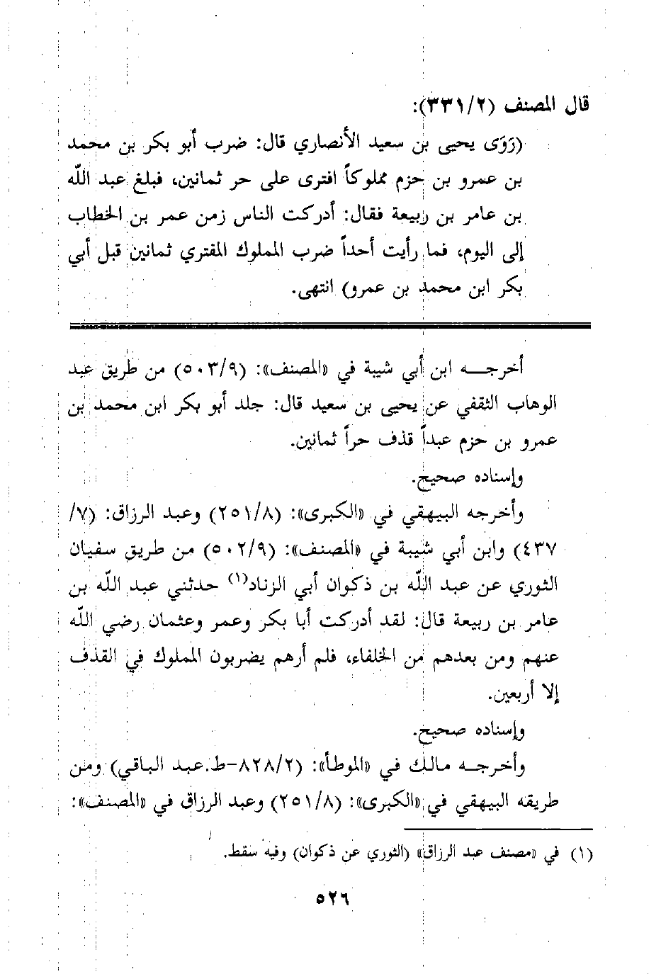 (رَوَى يحيى بن سعيد الأنصاري قال: ضرب أبو بكر بن محمد بن عمرو بن حزم مملوكاً افترى على حر ثمانين، فبلغ عبد الله بن عامر بن ربيعة فقال: أدركت الناس زمن عمر بن الخطاب إلى اليوم، فما رأيت أحداً ضرب المملوك المفتري ثمانين قبل أبي بكر ابن محمد بن عمرو) انتهى.
