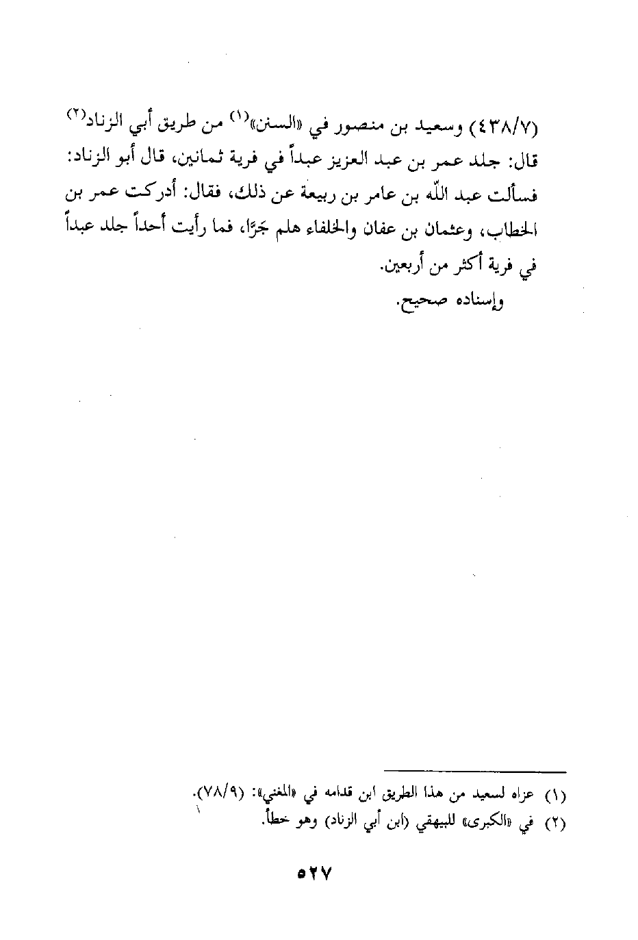 (7/438) وسعيد بن منصور في "السنن" من طريق أبي الزناد قال: جلد عمر بن عبد العزيز عبداً في فرية ثمانين، قال أبو الزناد: فسألت عبد الله بن عامر بن ربيعة عن ذلك، فقال: أدركت عمر بن الخطاب، وعثمان بن عفان والخلفاء هلم جَرَّا، فما رأيت أحداً جلد عبداً في فرية أكثر من أربعين.