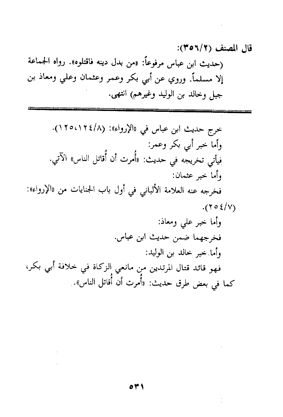 (حديث ابن عباس مرفوعاً: "من بدل دينه فاقتلوه". رواه الجماعة إلا مسلماً. وروي عن أبي بكر وعمر وعثمان وعلي ومعاذ بن جبل وخالد بن الوليد وغيرهم) انتهى.