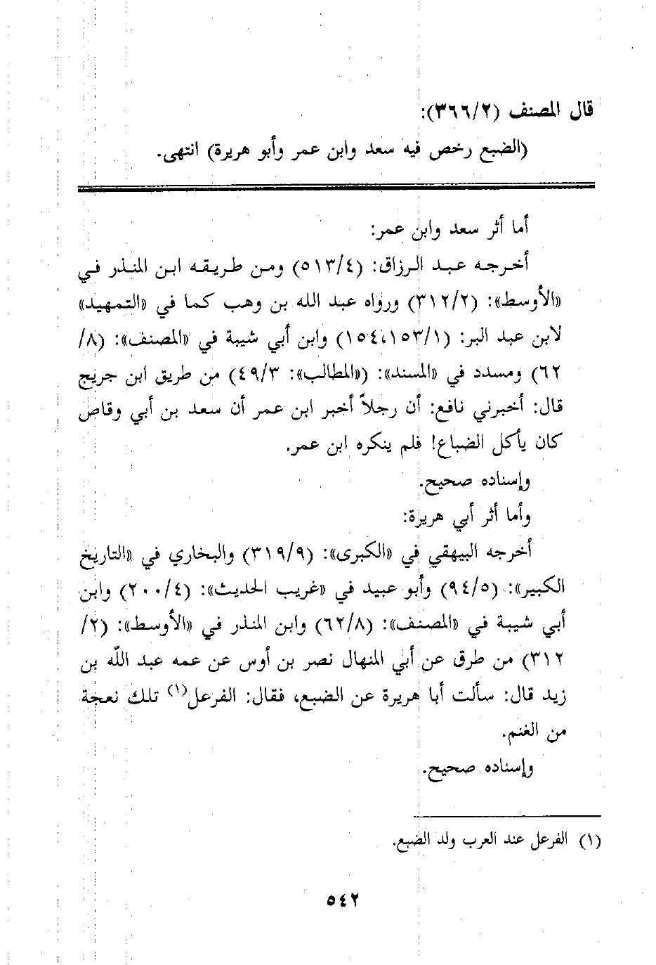 فأخرجه عبد الرزاق: (4/513) ومن طريقه ابن المنذر في "الأوسط": (2/312) ورواه عبد الله بن وهب كما في "التمهيد" لابن عبد البر: (1/153، 154) وابن أبي شيبة في "المصنف": (8/62) ومسدد في "المسند": ("المطالب": 3/49) من طريق ابن جريج قال: أخبرني نافع: أن رجلاً أخبر ابن عمر أن سعد بن أبي وقاص كان يأكل الضباع! فلم ينكره ابن عمر.