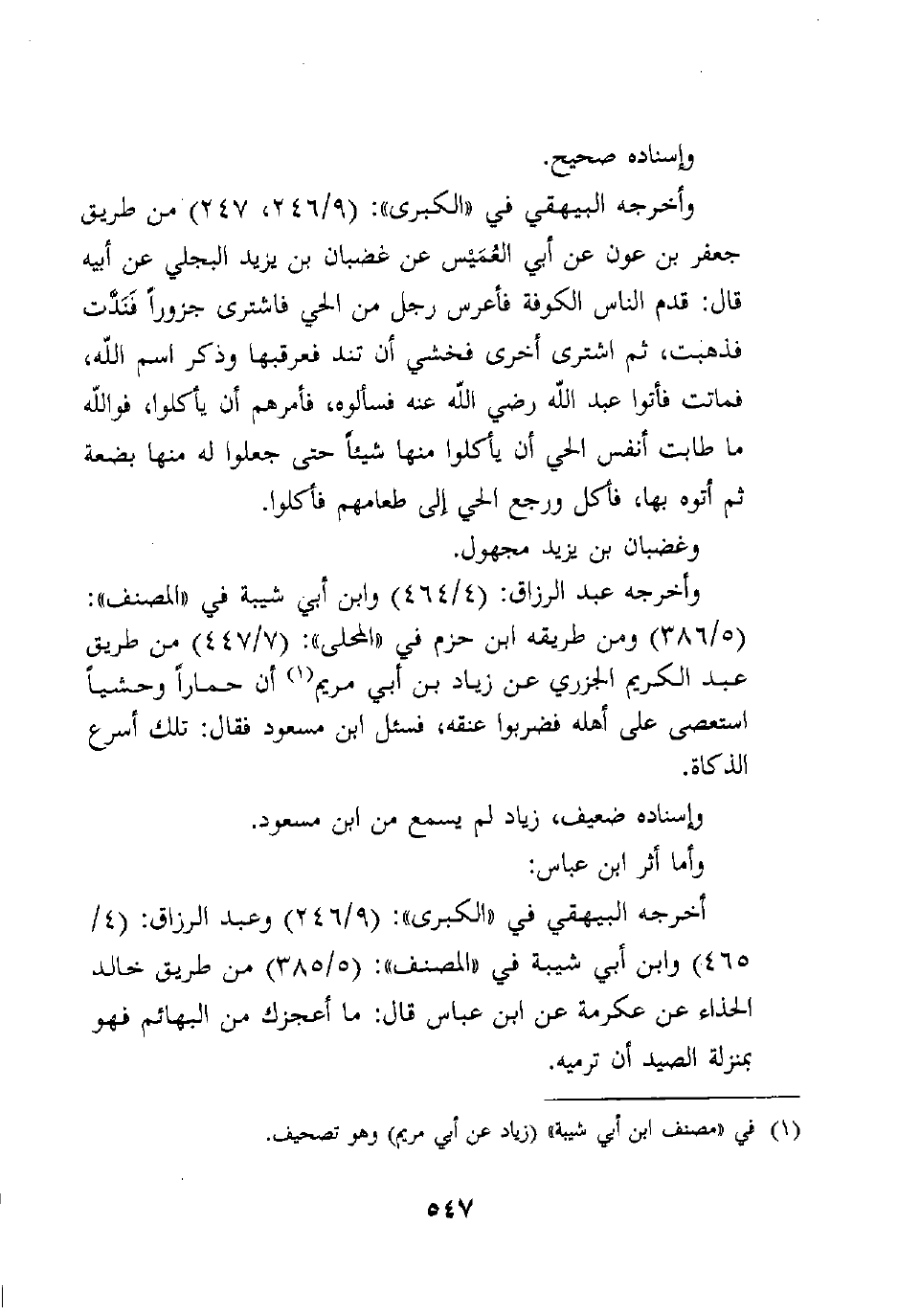 وأخرجه البيهقي في "الكبرى": (9/246، 247) من طريق جعفر بن عون عن أبي العُمَيْس عن غضبان بن يزيد البجلي عن أبيه قال: قدم الناس الكوفة فأعرس رجل من الحي فاشترى جزوراً فَنَدَّت فذهبت، ثم اشترى أخرى فخشي أن تند فعرقبها وذكر اسم الله، فماتت فأتوا عبد الله رضي الله عنه فسألوه، فأمرهم أن يأكلوا، فوالله ما طابت أنفس الحي أن يأكلوا منها شيئاً حتى جعلوا له منها بضعة ثم أتوه بها، فأكل ورجع الحي إلى طعامهم فأكلوا.