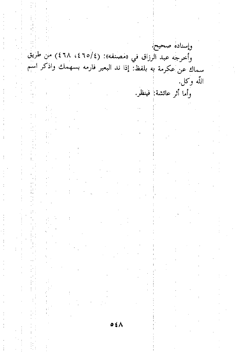 وأخرجه عبد الرزاق في "مصنفه": (4/465، 468) من طريق سماك عن عكرمة به بلفظ: إذا ند البعير فارمه بسهمك واذكر اسم الله وكل.