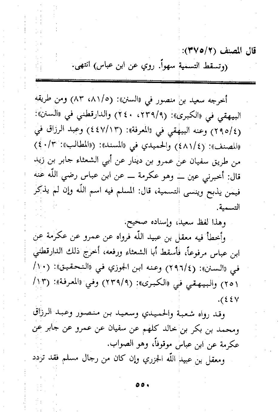 أخرجه سعيد بن منصور في "السنن": (5/81، 83) ومن طريقه البيهقي في "الكبرى": (9/239، 240) والدارقطني في "السنن": (4/295) وعنه البيهقي في "المعرفة": (13/447) وعبد الرزاق في "المصنف": (4/481) والحميدي في "المسند": ("المطالب": 3/40) من طريق سفيان عن عمرو بن دينار عن أبي الشعثاء جابر بن زيد قال: أخبرني عين _ وهو عكرمة _ عن ابن عباس رضي الله عنه فيمن يذبح وينسى التسمية، قال: المسلم فيه اسم الله وإن لم يذكر التسمية.