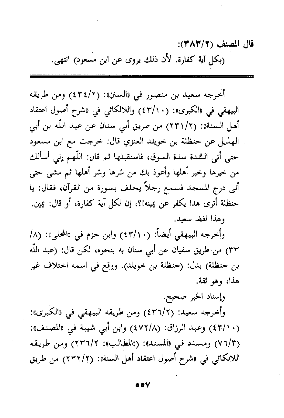 أخرجه سعيد بن منصور في "السنن": (2/434) ومن طريقه البيهقي في "الكبرى": (10/43) واللالكائي في "شرح أصول اعتقاد أهل السنة": (2/231) من طريق أبي سنان عن عبد الله بن أبي الهذيل عن حنظلة بن خويلد العنزي قال: خرجت مع ابن مسعود حتى أتى السُّدة سدة السوق، فاستقبلها ثم قال: اللهم إني أسألك من خيرها وخير أهلها وأعوذ بك من شرها وشر أهلها ثم مشى حتى أتى درج المسجد فسمع رجلاً يحلف بسورة من القرآن، فقال: يا حنظلة أترى هذا يكفر عن يمينه!؟، إن لكل آية كفارة، أو قال: يمين.