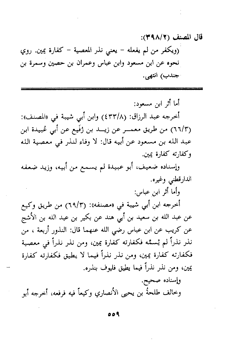 (ويكفر من لم يفعله - يعني نذر المعصية - كفارة يمين. روي نحوه عن ابن مسعود وابن عباس وعمران بن حصين وسمرة بن جندب) انتهى.