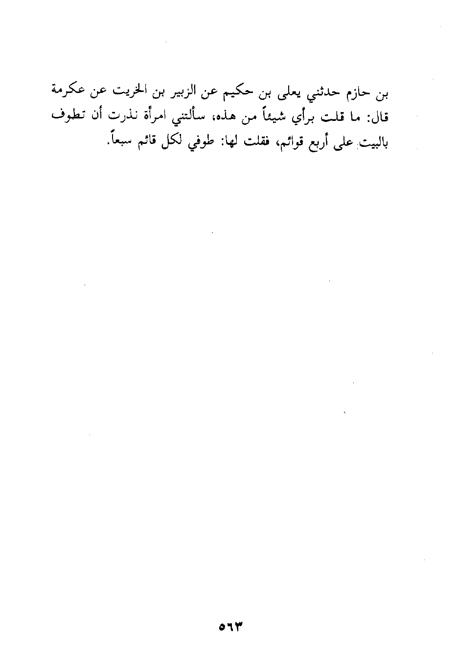 بن حازم حدثني يعلى بن حكيم عن الزبير بن الخريت عن عكرمة قال: ما قلت برأي شيئاً من هذه، سألتني امرأة نذرت أن تطوف بالبيت على أربع قوائم، فقلت لها: طوفي لكل قائم سبعاً.