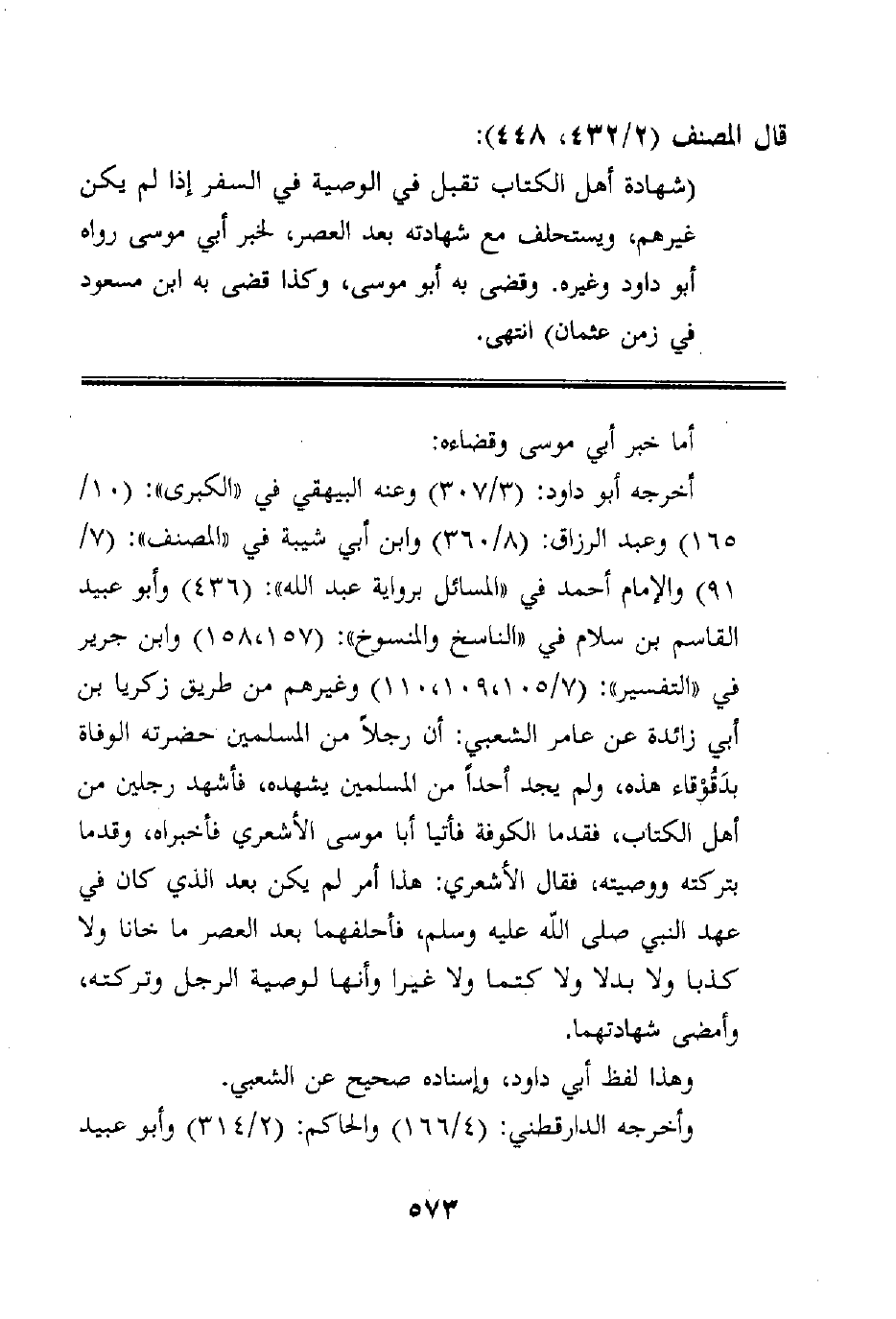 فأخرجه أبو داود: (3/307) وعنه البيهقي في "الكبرى": (10/165) وعبد الرزاق: (8/360) وابن أبي شيبة في "المصنف": (7/91) والإمام أحمد في "المسائل برواية عبد الله": (436) وأبو عبيد القاسم بن سلام في "الناسخ والمنسوخ": (157، 158) وابن جرير في "التفسير": (7/105، 109، 110) وغيرهم من طريق زكريا بن أبي زائدة عن عامر الشعبي: أن رجلاً من المسلمين حضرته الوفاة بدَقُوْقاء هذه، ولم يجد أحداً من المسلمين يشهده، فأشهد رجلين من أهل الكتاب، فقدما الكوفة فأتيا أبا موسى الأشعري فأخبراه، وقدما بتركته ووصيته، فقال الأشعري: هذا أمر لم يكن بعد الذي كان في عهد النبي صلى الله عليه وسلم، فأحلفهما بعد العصر ما خانا ولا كذبا ولا بدلا ولا كتما ولا غيرا وأنها لوصية الرجل وتركته، وأمضى شهادتهما.
