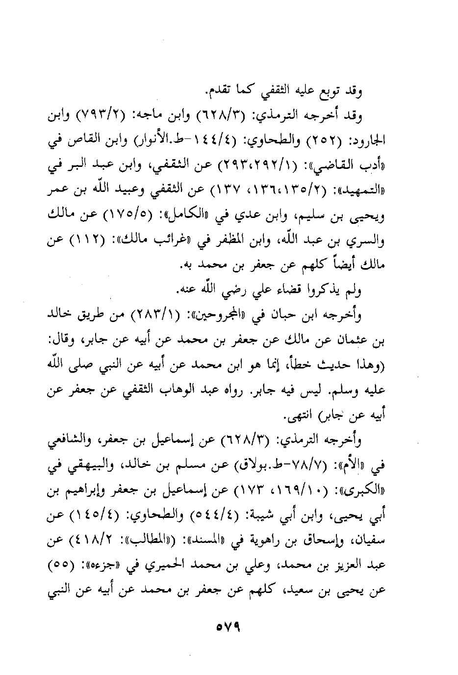 وقد أخرجه الترمذي: (3/628) وابن ماجه: (2/793) وابن الجارود: (252) والطحاوي: (4/144 - ط. الأنوار) وابن القاص في "أدب القاضي": (1/292، 293) عن الثقفي، وابن عبد البر في "التمهيد": (2/135، 136، 137) عن الثقفي وعبيد الله بن عمر ويحيى بن سليم، وابن عدي في "الكامل": (5/175) عن مالك والسري بن عبد الله، وابن المظفر في "غرائب مالك": (112) عن مالك أيضاً كلهم عن جعفر بن محمد به.