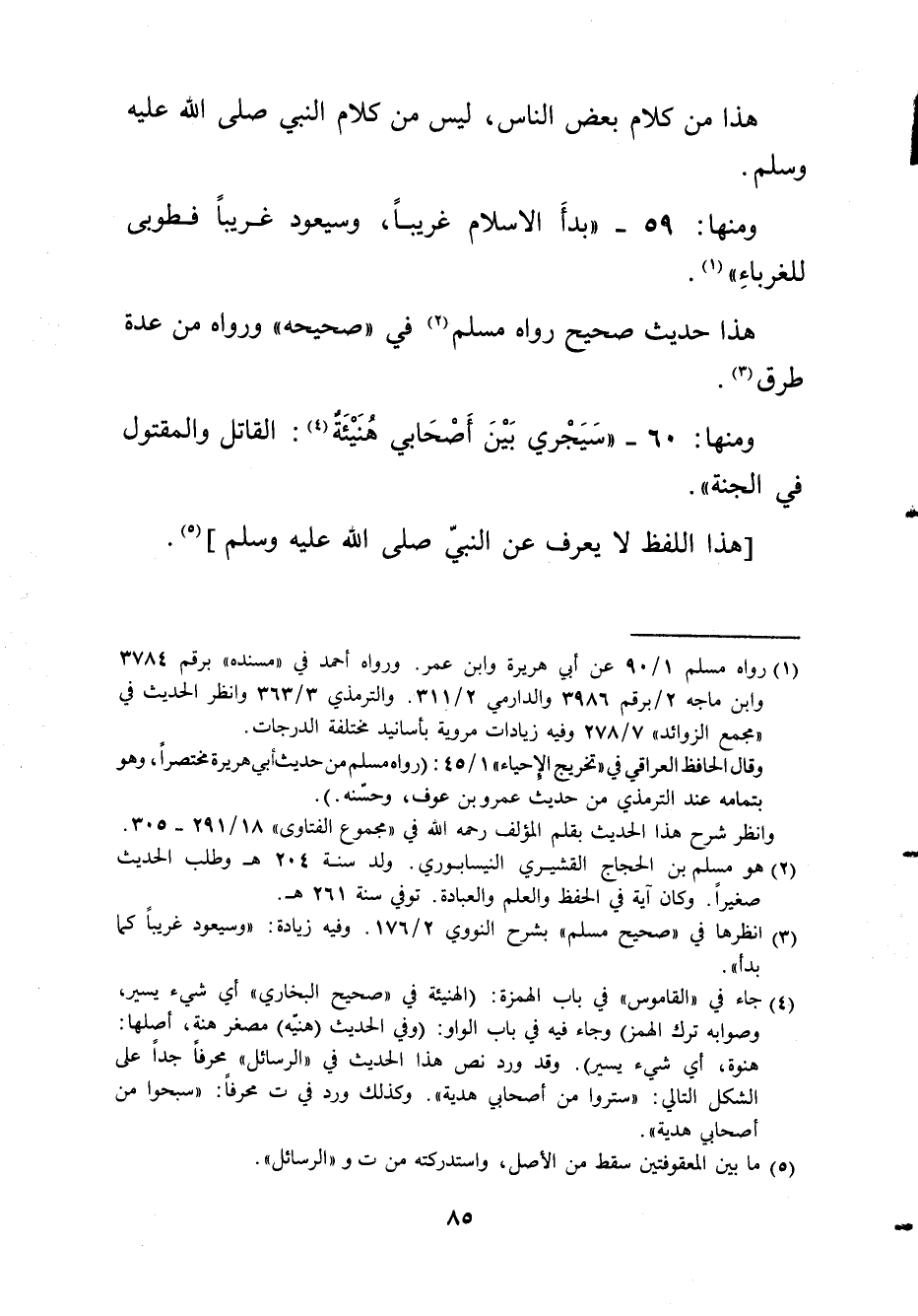 ومنها: 59- «بَدَأَ الْإِسْلَامُ غَرِيبًا، وَسَيَعُودُ غَرِيبًا [كَمَا بَدَأَ] * فَطُوبَى لِلْغُرَبَاءِ» .