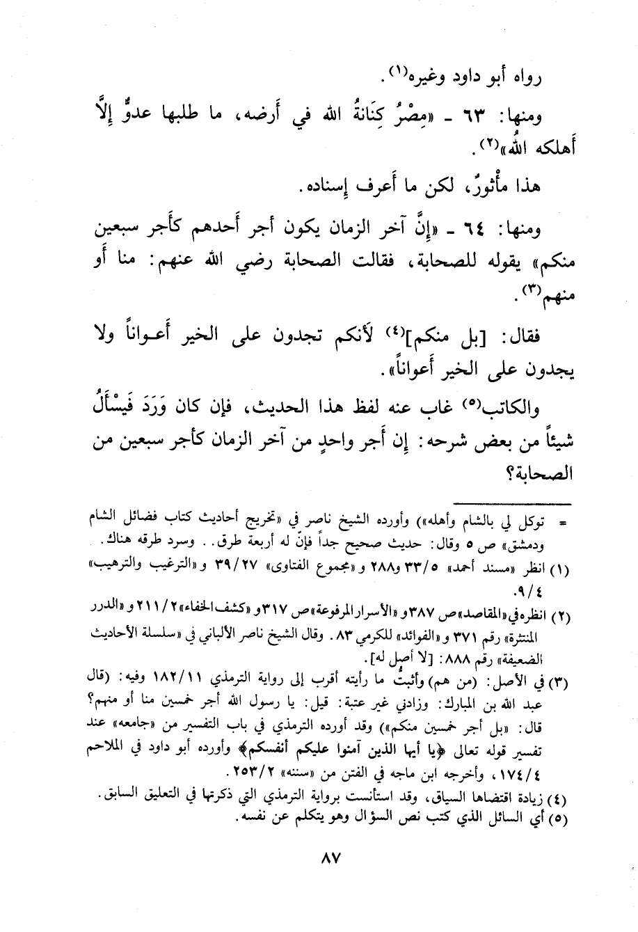 ومنها: 64- «إِنَّ [فِي] * آخِرِ الزَّمَانِ يَكُونُ أَجْرُ أَحَدِهِمْ كَأَجْرِ سَبْعِينَ مِنْكُمْ» يقوله للصحابة، فقالت الصحابة رضي الله عنهم: [مِنْهُمْ] **؟