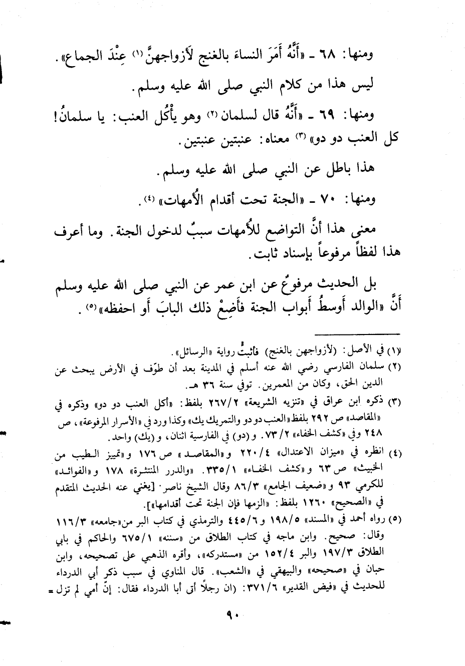 ومنها: 70- «الْجَنَّةُ تَحْتَ أَقْدَامِ الْأُمَّهَاتِ» .