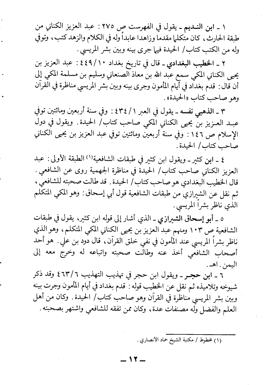 حدثنا أبو حفص محمد بن عمر بن محمد بن رجاء قال ثنا أبو أيوب عبد الوهاب بن عمرو النزلي قال حدثني أبو القاسم العطاف بن مسلم قال حدثني الحسين بن بشر ودبيس الصائغ ومحمد بن فرقد قالوا: قال لنا عبد العزيز بن يحي المكي الكناني: "أرسل إلي المأمون أمير المؤمنين وأحضرني وأحضر بشر" ... الخ. ثم ذكر نماذج من كتاب الحيدة استغرق من ورقة 160/ ب سطر 12 إلى ورقة 165/ أسطر 17 لأن الصفحة تشمل 23 سطرا ثم اتبعها بقوله: باب ذكر محنة أبي عبد الله أحمد بن حنبل رحمه الله لابن1 داود وأصحابه بحضرة المعتصم ... الخ.