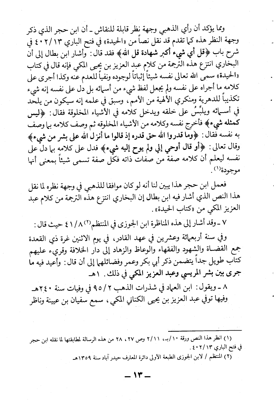 الثاني: أن المناظرة بين الكناني وبشر المريسي ثابتة كحادثة تأريخية بين يدي المأمون لم يشك في وقوعها أحد لا الذهبي ولا السبكي، فكلاهما يثبتها، بل إن الذهبي أثبت إضافة إلى المناظرة كتاب الحيدة في كتابيه العبر، ودول الإسلام.