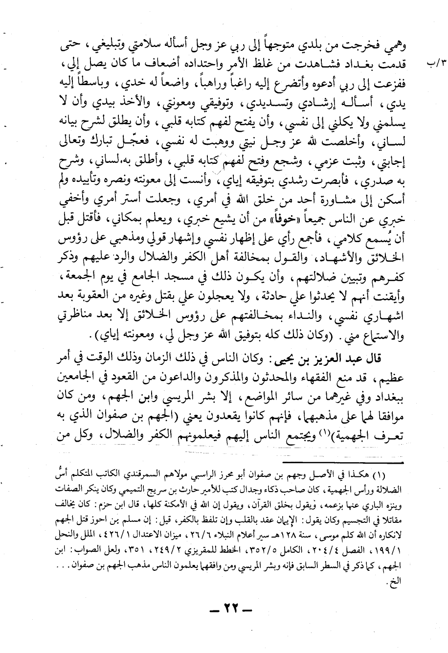 1 هكذا في الأصل وجهم بن صفوان أبو محرز الراسبي مولاهم السمرقندي الكاتب المتكلم أس الضلالة ورأس الجهمية، كان صاحب ذكاء وجدال كتب للأمير حارث بن سريج التميمي وكان ينكر الصفات وينزه الباري عها بزعمه، فلقول بخلق القرآن ولقول إن الله في الأمكنة كلها، قال ابن حزم: كان يخالف مقاتلا في التجسيم وكان يقول: الأيمان عقد بالقلب وإن تلفظ بالكفر، قيل: إن مسلم بهن أحوز قتل الجهم لإنكاره أن الله كلم موسى، سنة 128 هـ سير أعلام النبلاء6/ 26، ميزان الاعتدال 1/426، الملل والنحل 1/ 199، الفصل 4/ 204، الكامل 5/ 352، الخطط للمقريزي 2/ 249، 351، ولعل الصواب: ابن الجهم، كما ذكر في السطر السابق فإنه وبشر المريسي ومن وافقهما يعلمون الناس مذهب الجهم بن صفوان ... الخ.