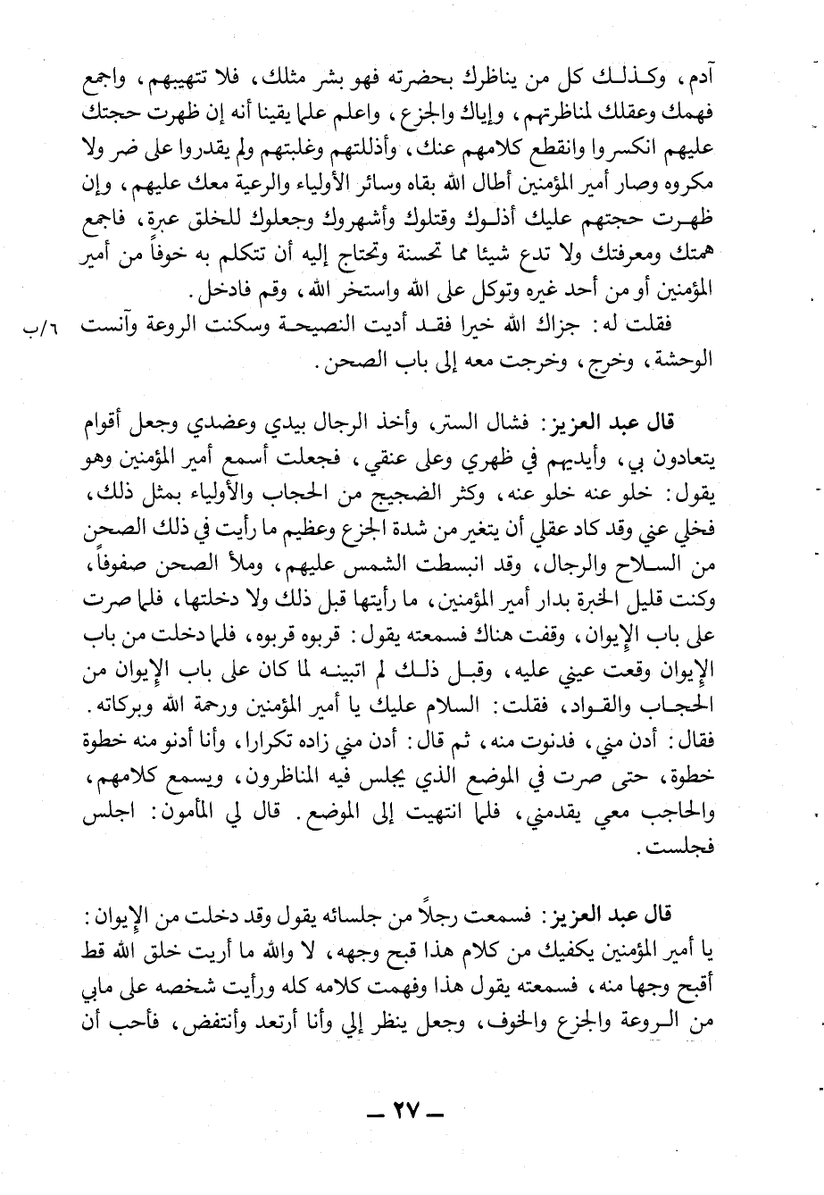 آدم، وكذلك كل من يناظرك بحضرته فهو بشر مثلك، فلا تتهيبهم، واجمع فهمك وعقلك لمناظرتهم، وإياك والجزع، واعلم علما يقينا أنه إن ظهرت حجتك عليهم انكسروا وانقطع كلامهم عنك، وأذللتهم وغلبتهم ولم يقدروا على ضر ولا مكروه وصار أمير المؤمنين أطال الله بقاه وسائر الأولياء والرعية معك عليهم، وإن ظهرت حجتهم عليك أذلوك وقتلوك وأشهروك وجعلوك للخلق عبرة، فاجمع همتك ومعرفتك ولا تدع شيئا مما تحسنة وتحتاج إليه أن تتكلم به خوفا من أمير المؤمنين أو من أحد غيره وتوكل على الله واستخر الله، وقم فادخل".