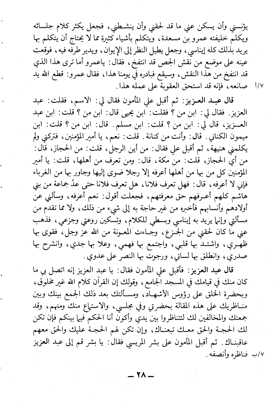 قال عبد العزيز: فأقبل علي المأمون فقال: "يا عبد العزيز إنه اتصل بي ما كان منك في قيامك في المسجد الجامع، وقولك إن القرآن كلام الله غير مخلوق، وبحضرة الخلق على رؤوس الأشهاد، ومسألتك بعد ذلك الجمع بينك وبين مناظريك على هذه المقالة بحضرتي وفي مجلسي، والاستماع منك ومنهم، وقد جمعتك والمخالفين لك لتتناظروا بين يدي وأكون آنا الحكم فيما بينكم فإن تكن لك الحجة والحق معك تبعناك، وإن تكن لهم الحجة عليك والحق معهم عاقبناك. ثم أقبل المأمون على بشر المريسي" فقال: "يا بشر قم إلى عبد العزيز نناظره وأنصفه".