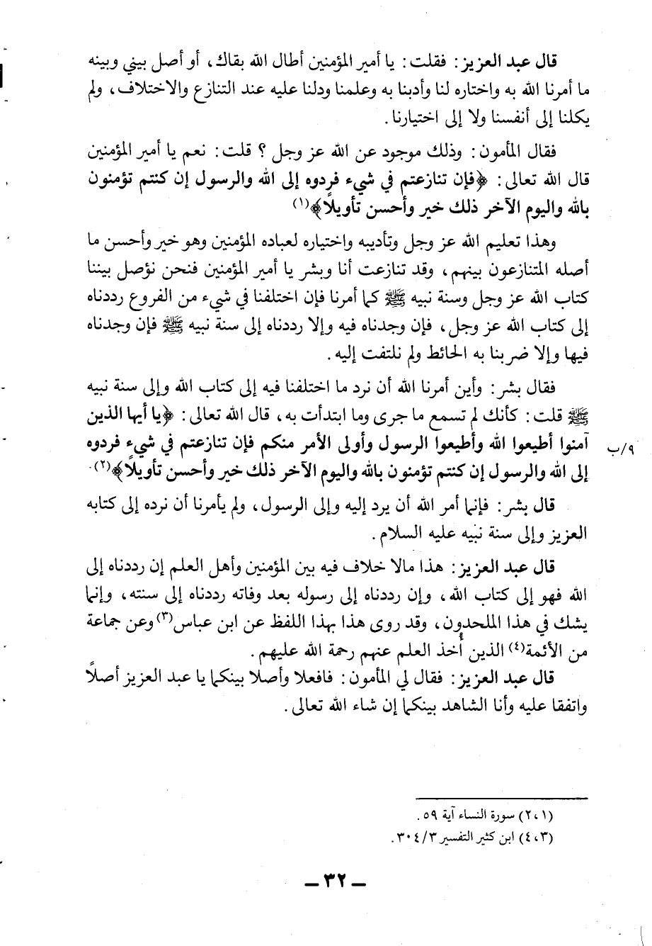 فقال المأمون: "وذلك موجود عن الله عز وجل"؟ قلت: "نعم يا أمير المؤمنين قال الله تعالى: {فَإِنْ تَنَازَعْتُمْ فِي شَيْءٍ فَرُدُّوهُ إِلَى اللَّهِ وَالرَّسُولِ إِنْ كُنْتُمْ تُؤْمِنُونَ بِاللَّهِ وَالْيَوْمِ الآخِرِ ذَلِكَ خَيْرٌ وَأَحْسَنُ تَأْوِيلاً} 1