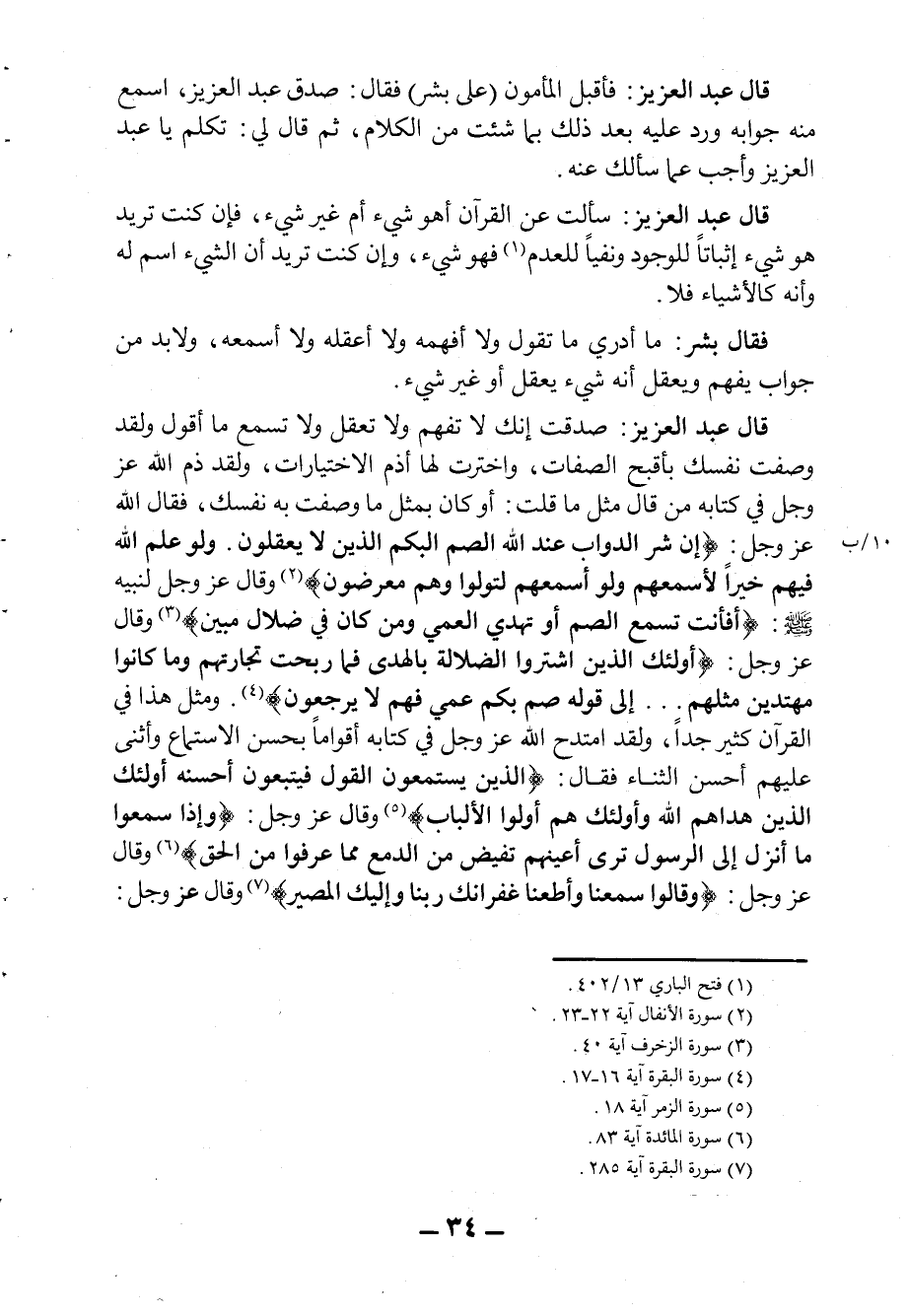 قال عبد العزيز: "صدقت إنك لا تفهم ولا تعقل ولا تسمع ما أقول ولقد وصفت نفسك بأقبح الصفات، واخترت لها أذم الاختيارات، ولقد ذم الله عز وجل في كتابه من قال مثل ما قلت: أو كان بمثل ما وصفت به نفسك، فقال الله عز وجل: {إِنَّ شَرَّ الدَّوَابِّ عِنْدَ اللَّهِ الصُّمُّ الْبُكْمُ الَّذِينَ لا يَعْقِلُونَ وَلَوْ عَلِمَ اللَّهُ فِيهِمْ خَيْراً لأسْمَعَهُمْ وَلَوْ أَسْمَعَهُمْ لَتَوَلَّوْا وَهُمْ مُعْرِضُونَ} 2 وقال عزوجل لنبيه صلى الله عليه وسلم: {أَفَأَنْتَ تُسْمِعُ الصُّمَّ أَوْ تَهْدِي الْعُمْيَ وَمَنْ كَانَ فِي ضَلالٍ مُبِينٍ} 3 وقال عز وجل: {أُولَئِكَ الَّذِينَ اشْتَرَوُا الضَّلالَةَ بِالْهُدَى فَمَا رَبِحَتْ تِجَارَتُهُمْ وَمَا كَانُوا مُهْتَدِينَ} ... إلى قوله {صُمٌّ بُكْمٌ عُمْيٌ فَهُمْ لا يَرْجِعُونَ} 4. ومثل هذا في القرآن كثير جدا، ولقد امتدح الله عز وجل في كتابه أقواما بحسن الاستماع وأثنى عليهم أحسن الثناء فقال: {الَّذِينَ يَسْتَمِعُونَ الْقَوْلَ فَيَتَّبِعُونَ أَحْسَنَهُ أُولَئِكَ الَّذِينَ هَدَاهُمُ اللَّهُ وَأُولَئِكَ هُمْ أُولُو الأَلْبَابِ} 5 وقال عز وجل: {وَإِذَا سَمِعُوا مَا أُنْزِلَ إِلَى الرَّسُولِ تَرَى أَعْيُنَهُمْ تَفِيضُ مِنَ الدَّمْعِ مِمَّا عَرَفُوا مِنَ الْحَقِّ} 6 وقالت عز وجل: {وَقَالُوا سَمِعْنَا وَأَطَعْنَا غُفْرَانَكَ رَبَّنَا وَإِلَيْكَ الْمَصِيرُ} 7 وقال عز وجل: