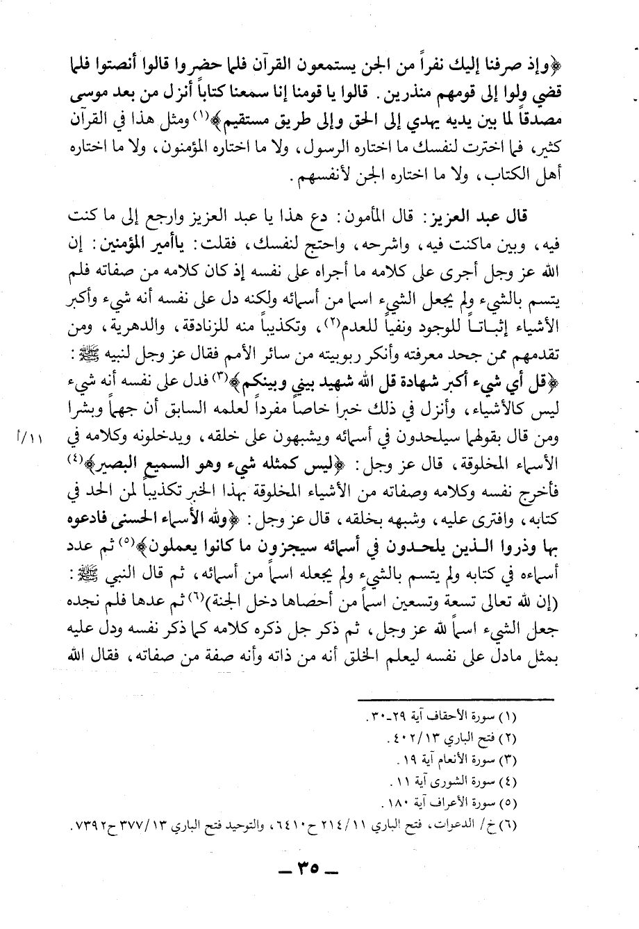 قال عبد العزيز: قال المأمون: دع هذا يا عبد العزيز وارجع إلى ما كنت فيه، وبين ما كنت فيه، واشرحه، واحتج لنفسك، فقلت: يا أمير المؤمنين: إن الله عز وجل أجرى على كلامه ما أجراه على نفسه إذ كان كلامه من صفاته فلم يتسم بالشيء ولم يجعل الشيء اسما من أسمائه ولكنه دل على نفسه أنه شيء وأكبر الأشياء إثباتا للوجود ونفيا للعدم2، وتكذيبا منه للزنادقة، والدهرية، ومن تقدمهم ممن جحد معرفته وأنكر ربوبيته من سائر الأمم فقال عز وجل لنبيه صلى الله عليه وسلم: {قُلْ أَيُّ شَيْءٍ أَكْبَرُ شَهَادَةً قُلِ اللَّهُ شَهِيدٌ بَيْنِي وَبَيْنَكُمْ} 3 فدل على نفسه أنه شيء ليس كالأشياء، وأنزل في ذلك خبرا خاصا مفردا لعلمه السابق أن جهما وبشرا ومن قال بقولهما سيلحدون في أسمائه ويشبهون على خلقه، ويدخلونه وكلامه في الأسماء المخلوقة، قال عزوجل: {لَيْسَ كَمِثْلِهِ شَيْءٌ وَهُوَ السَّمِيعُ الْبَصِيرُ} 4 فأخرج نفسه وكلامه وصفاته من الأشياء المخلوقة بهذا الخبر تكذيبا لمن الحد في كتابه، وافترى عليه، وشبهه بخلقه، قال عزوجل: {وَلِلَّهِ الْأَسْمَاءُ الْحُسْنَى فَادْعُوهُ بِهَا وَذَرُوا الَّذِينَ يُلْحِدُونَ فِي أَسْمَائِهِ سَيُجْزَوْنَ مَا كَانُوا يَعْمَلُونَ} 5 ثم عدد أسماءه في كتابه ولم يتسم بالشيء ولم يجعله اسما من أسمائه، ثم قال النبي صلى الله عليه وسلم: "إن لله تعالى تسعة وتسعين اسما من أحضاها دخل الجنة" 6 ثم عدها فلم نجده جعل الشيء اسما لله عزوجل، ثم ذكر جل ذكره كلامه كما ذكر نفسه ودل عليه بمثل ما دل على نفسه ليعلم الخلق أنه من ذاته وأنه صفة من صفاته، فقال الله.