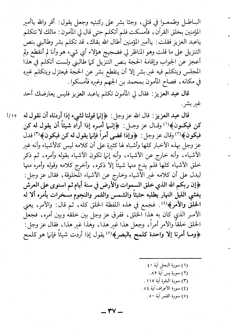 قال عبد العزيز: "قال الله عز وجل: {إِنَّمَا قَوْلُنَا لِشَيْءٍ إِذَا أَرَدْنَاهُ أَنْ نَقُولَ لَهُ كُنْ فَيَكُونُ} 1 وقال عز وجل: {إِنَّمَا أَمْرُهُ إِذَا أَرَادَ شَيْئاً أَنْ يَقُولَ لَهُ كُنْ فَيَكُونُ} 2 وقالت عز وجل: {وَإِذَا قَضَى أَمْراً فَإِنَّمَا يَقُولُ لَهُ كُنْ فَيَكُونُ} 3 فدل عز وجل بهذه الأخبار كلها وأشباه لها كثيرة على أن كلامه ليس كالأشياء وأنه غير الأشياء، وأنه خارج عن الأشياء، وأنه إنما تكون الأشياء بقوله وأمره، ثم ذكر خلق الأشياء كلها فلم يدع منها شيئا إلا ذكره، وأخرج كلامه وقوله وأمره منها ليدل على أن كلامه غير الأشياء وخارج عن الأشياء المخلوقة، فقال عز وجل: {إِنَّ رَبَّكُمُ اللَّهُ الَّذِي خَلَقَ السَّمَاوَاتِ وَالأَرْضَ فِي سِتَّةِ أَيَّامٍ ثُمَّ اسْتَوَى عَلَى الْعَرْشِ يُغْشِي اللَّيْلَ النَّهَارَ يَطْلُبُهُ حَثِيثاً وَالشَّمْسَ وَالْقَمَرَ وَالنُّجُومَ مُسَخَّرَاتٍ بِأَمْرِهِ} 4. فجمع في هذه اللفظة الخلق كله، ثم قال: والأمر، يعني الأمر الذي كان به هذا الخلق، ففرق عز وجل بين خلقه وبين أمره، فجعل الخلق خلقا والأمر أمرا، وجعل هذا غير هذا، وهذا غير هذا، فقال عز وجل: {وَمَا أَمْرُنَا إِلاّ وَاحِدَةٌ كَلَمْحٍ بِالْبَصَرِ} 5 يقول إذا أردت شيئا فإنما هو كلمح