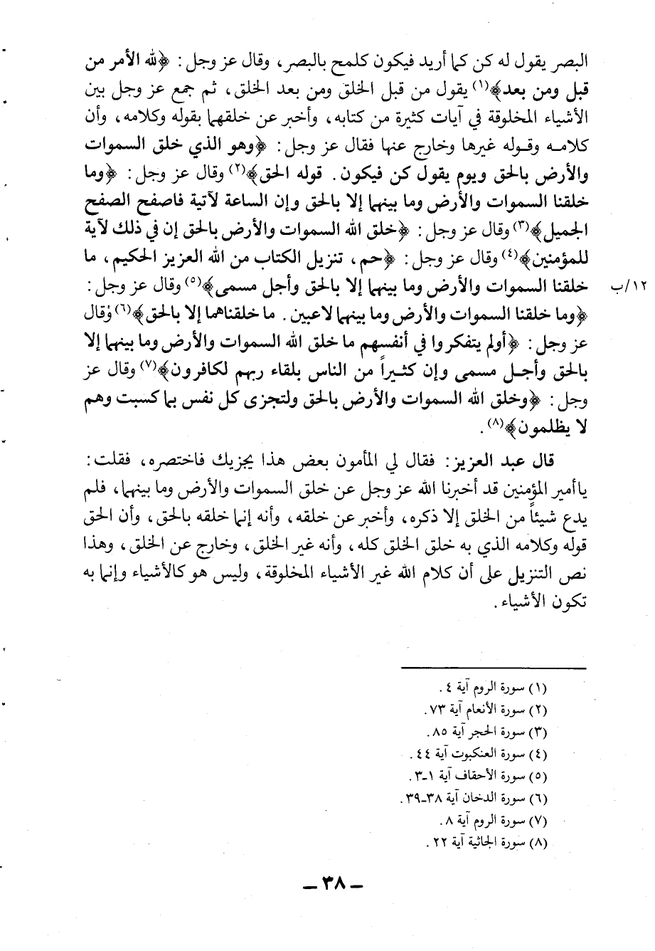 البصر يقول له كن كما أريد فيكون كلمح بالبصر، وقال عز وجل: {لِلَّهِ الأَمْرُ مِنْ قَبْلُ وَمِنْ بَعْدُ} 1 يقول من قبل الخلق ومن بعد الخلق، ثم جمع عزوجل بين الأشياء المخلوقة في آيات كثيرة من كتابه، وأخبر عن خلقهما بقوله وكلامه، وأن كلامه وقوله غيرها وخارج عنها فقال عز وجل: {وَهُوَ الَّذِي خَلَقَ السَّمَاوَاتِ وَالأَرْضَ بِالْحَقِّ وَيَوْمَ يَقُولُ كُنْ فَيَكُونُ قَوْلُهُ الْحَقّ} 2 وقال عز وجل: {وَمَا خَلَقْنَا السَّمَاوَاتِ وَالأَرْضَ وَمَا بَيْنَهُمَا إِلاّ بِالْحَقِّ وَإِنَّ السَّاعَةَ لآتِيَةٌ فَاصْفَحِ الصَّفْحَ الْجَمِيلَ} 3 وقال عز وجل: {خَلَقَ اللَّهُ السَّمَاوَاتِ وَالأَرْضَ بِالْحَقِّ إِنَّ فِي ذَلِكَ لآيَةً لِلْمُؤْمِنِينَ} 4 وقال عز وجل: {حم، تَنْزِيلُ الْكِتَابِ مِنَ اللَّهِ الْعَزِيزِ الْحَكِيمِ، مَا خَلَقْنَا السَّمَاوَاتِ وَالأَرْضَ وَمَا بَيْنَهُمَا إِلاّ بِالْحَقِّ وَأَجَلٍ مُسَمّىً} 5 وقال عز وجل: {وَمَا خَلَقْنَا السَّمَاوَاتِ وَالأَرْضَ وَمَا بَيْنَهُمَا لاعِبِينَ مَا خَلَقْنَاهُمَا إِلاّ بِالْحَقّ} 6 وقال عز وجل: {أَوَلَمْ يَتَفَكَّرُوا فِي أَنْفُسِهِمْ مَا خَلَقَ اللَّهُ السَّمَاوَاتِ وَالأَرْضَ وَمَا بَيْنَهُمَا إِلاّ بِالْحَقِّ وَأَجَلٍ مُسَمّىً وَإِنَّ كَثِيراً مِنَ النَّاسِ بِلِقَاءِ رَبِّهِمْ لَكَافِرُونَ} 7 وقال عز وجل: {وَخَلَقَ اللَّهُ السَّمَاوَاتِ وَالأَرْضَ بِالْحَقِّ وَلِتُجْزَى كُلُّ نَفْسٍ بِمَا كَسَبَتْ وَهُمْ لا يُظْلَمُونَ} "8.
