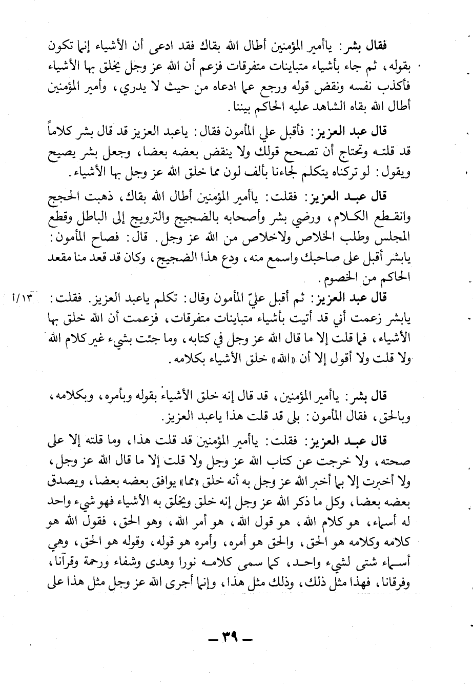 قال عبد العزيز: "ثم أقبل علي المأمون وقال: تكلم يا عبد العزيز. فقلت: يا بشر زعمت أني قد أتيت بأشياء متباينات متفرقات، فزعمت أن الله خلق بها الأشياء، فما قلت إلا ما قال الله عزوجل في كتابه، وما جئت بشيء غير كلام الله ولا قلت ولا أقول إلا أن "الله " خلق الأشياء بكلامه.