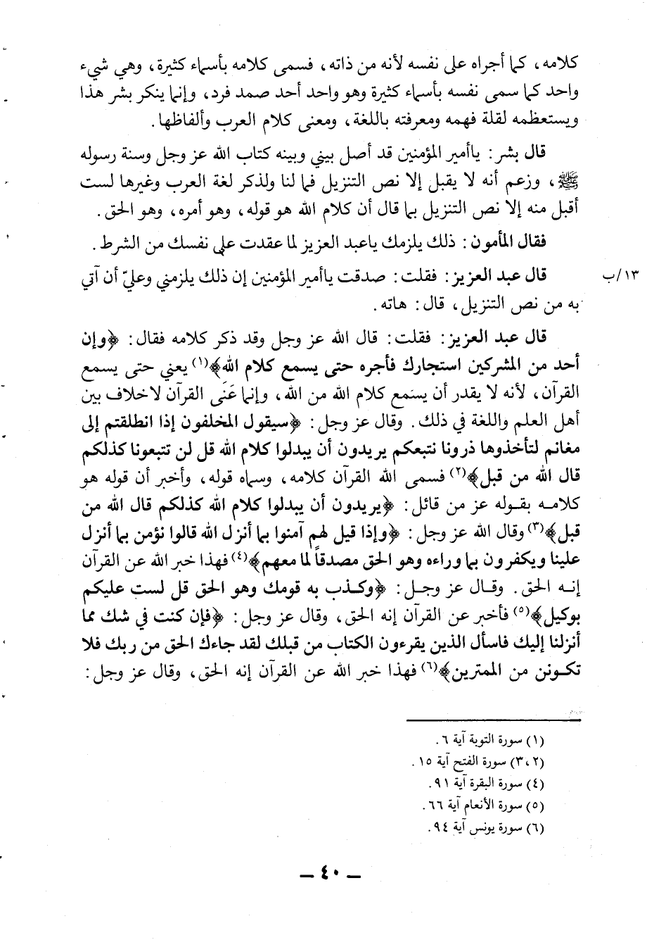 قال عبد العزيز: فقلت: "قال الله عز وجل وقد ذكر كلامه فقال: {وَإِنْ أَحَدٌ مِنَ الْمُشْرِكِينَ اسْتَجَارَكَ فَأَجِرْهُ حَتَّى يَسْمَعَ كَلامَ اللَّه} 1 يعني حتى يسمع القرآن، لأنه لا يقدر أن يسمع كلام الله من الله، وإنما غنى القرآن لا خلاف بين أهل العلم واللغة في ذلك. وقال عز وجل: {سَيَقُولُ الْمُخَلَّفُونَ إِذَا انْطَلَقْتُمْ إِلَى مَغَانِمَ لِتَأْخُذُوهَا ذَرُونَا نَتَّبِعْكُمْ يُرِيدُونَ أَنْ يُبَدِّلُوا كَلامَ اللَّهِ قُلْ لَنْ تَتَّبِعُونَا كَذَلِكُمْ قَالَ اللَّهُ مِنْ قَبْلُ} 2 فسمى الله القرآن كلامه، وسماه قوله، وأخبر أن قوله هو كلامه بقوله عز من قائل: {يُرِيدُونَ أَنْ يُبَدِّلُوا كَلامَ اللَّهِ قُلْ لَنْ تَتَّبِعُونَا كَذَلِكُمْ قَالَ اللَّهُ مِنْ قَبْلُ} 3 وقال الله عز وجل: {وَإِذَا قِيلَ لَهُمْ آمِنُوا بِمَا أَنْزَلَ اللَّهُ قَالُوا نُؤْمِنُ بِمَا أُنْزِلَ عَلَيْنَا وَيَكْفُرُونَ بِمَا وَرَاءَهُ وَهُوَ الْحَقُّ مُصَدِّقاً لِمَا مَعَهُمْ} 4 فهذا خبر الله عن القرآن إنه الحق. وقال عز وجل: {وَكَذَّبَ بِهِ قَوْمُكَ وَهُوَ الْحَقُّ قُلْ لَسْتُ عَلَيْكُمْ بِوَكِيلٍ} 5 فأخبر عن القرآن إنه الحق، وقال عز وجل: {فَإِنْ كُنْتَ فِي شَكٍّ مِمَّا أَنْزَلْنَا إِلَيْكَ فَاسْأَلِ الَّذِينَ يَقْرَأُونَ الْكِتَابَ مِنْ قَبْلِكَ لَقَدْ جَاءَكَ الْحَقُّ مِنْ رَبِّكَ فَلا تَكُونَنَّ مِنَ الْمُمْتَرِينَ} 6 فهذا خبر الله عن القرآن إنه الحق، وقال عز وجل: