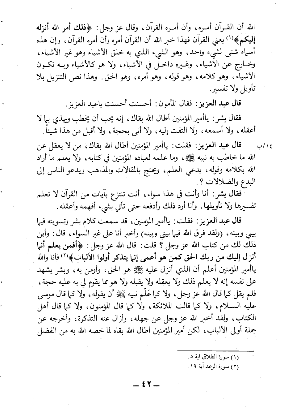 قال عبد العزيز: فقلت: "يا أمير المؤمنين، قد سمعت كلام بشر وتسويته فيما بيني وبينه، (ولقد فرق الله فيما بيني وبينه) وأخبر أنا على غير السواء، قال: وأين ذلك لك من كتاب الله عز وجل؟ قلت: قال الله عز وجل: {أَفَمَنْ يَعْلَمُ أَنَّمَا أُنْزِلَ إِلَيْكَ مِنْ رَبِّكَ الْحَقُّ كَمَنْ هُوَ أَعْمَى إِنَّمَا يَتَذَكَّرُ أُولُو الأَلْبَابِ} 2 فأنا والله يا أمير المؤمنين أعلم أن الذي أنزل عليه صلى الله عليه وسلم هو الحق، وأومن به، وبشر يشهد على نفسه إنه لا يعلم ذلك ولا يعقله ولا يقبله ولا هو مما يقوم لي به عليه حجة، فلم يقل كما قال الله عزوجل، ولا كما علم نبيه صلى الله عليه وسلم أن يقوله، ولا كما قال موسى عليه السلام، ولا كما قالت الملائكة، ولا كما قال المؤمنون، ولا كما قال أهل الكتاب، ولقد أخبر الله عز وجل عن جهله, وأزال عنه التذكرة, وأخرجه عن جملة أولى الألباب، لكن أمير المؤمنين أطال الله بقاه لما خصه الله به من الفضل