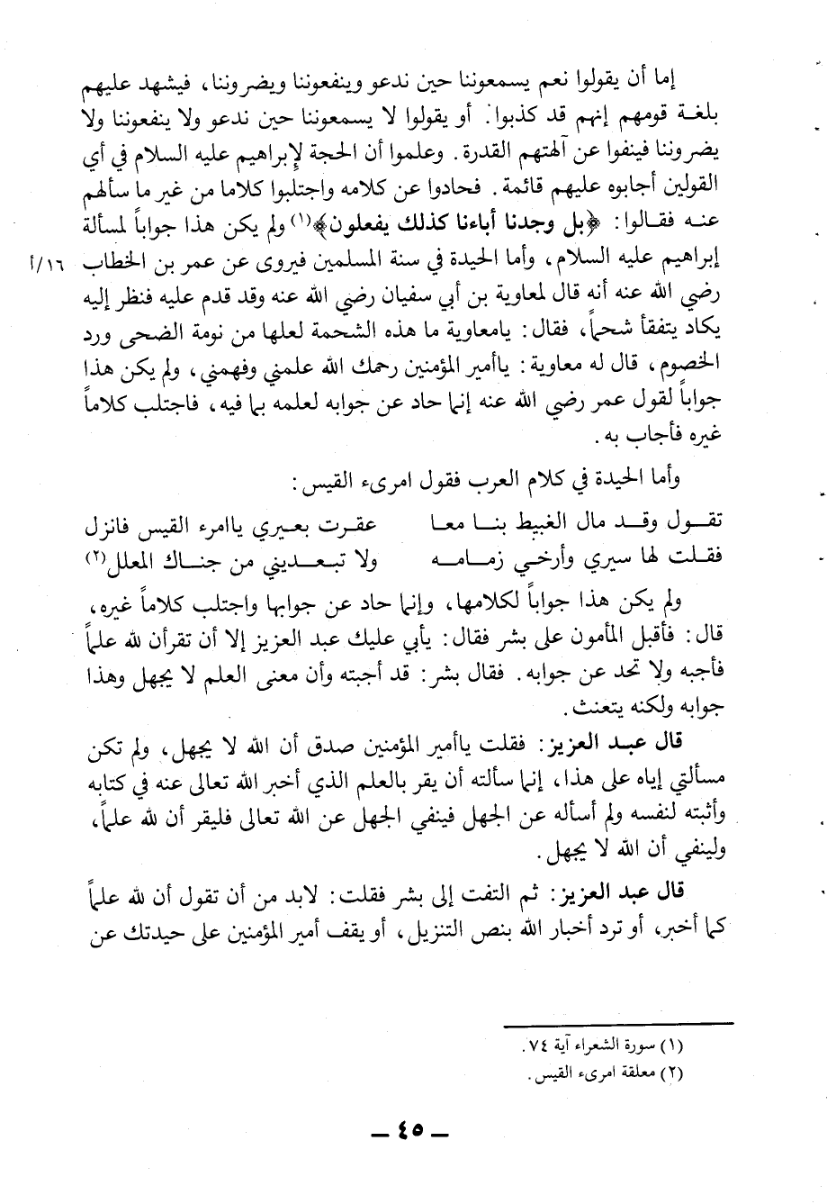 إما أن يقولوا نعم يسمعوننا حين ندعو وينفعوننا ويضروننا، فيشهد عليهم بلغة قومهم إنهم قد كذبوا. أو يقولوا لا يسمعوننا حين ندعو ولا ينفعوننا ولا يضروننا فينفوا عن آلهتهم القدرة. وعلموا أن الحجة لإبراهيم عليه السلام في أي القولين أجابوه عليهم قائمة. فحادوا عن كلامه واجتلبوا كلاما من غير ما سألهم عنه فقالوا: {بَلْ وَجَدْنَا آبَاءَنَا كَذَلِكَ يَفْعَلُونَ} 1 ولم يكن هذا جوابا لمسألة إبراهيم عليه السلام، وأما الحيدة في سنة المسلمين فيروى عن عمر بن الخطاب رضي الله عنه أنه قال لمعاوية بن أبي سفيان رضي الله عنه وقد قدم عليه فنظر إليه يكاد يتفقا شحما، فقال: يا معاوية ما هذه الشحمة لعلها من نومة الضحى ورد الخصوم، قال له معاوية: يا أمير المؤمنين رحمك الله علمني وفهمني، ولم يكن هذا جوابا لقول عمر رضي الله عنه إنما حاد عن جوابه لعلمه بما فيه، فاجتلب كلاما غيره فأجاب به.