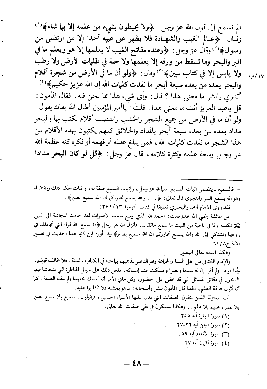 ألم تسمع إلى قول الله عز وجل: {وَلا يُحِيطُونَ بِشَيْءٍ مِنْ عِلْمِهِ إِلاّ بِمَا شَاءَ} 1 وقال: {عَالِمُ الْغَيْبِ فَلا يُظْهِرُ عَلَى غَيْبِهِ أَحَداً إِلاّ مَنِ ارْتَضَى مِنْ رَسُول} 2 وقال عز وجل: {وَعِنْدَهُ مَفَاتِحُ الْغَيْبِ لا يَعْلَمُهَا إِلاّ هُوَ وَيَعْلَمُ مَا فِي الْبَرِّ وَالْبَحْرِ وَمَا تَسْقُطُ مِنْ وَرَقَةٍ إِلاّ يَعْلَمُهَا وَلا حَبَّةٍ فِي ظُلُمَاتِ الأَرْضِ وَلا رَطْبٍ وَلا يَابِسٍ إِلاّ فِي كِتَابٍ مُبِينٍ} 3 وقال: {وَلَوْ أَنَّمَا فِي الأَرْضِ مِنْ شَجَرَةٍ أَقْلامٌ وَالْبَحْرُ يَمُدُّهُ مِنْ بَعْدِهِ سَبْعَةُ أَبْحُرٍ مَا نَفِدَتْ كَلِمَاتُ اللَّهِ إِنَّ اللَّهَ عَزِيزٌ حَكِيمٌ} 4 أتدري يا بشر ما معنى هذا؟ قال: وأي شيء هذا مما نحن فيه. فقال المأمون: قل يا عبد العزيز أنت ما معنى هذا. قلت: يا أمير المؤمنين أطال الله بقاك يقول: ولو أن ما في الأرض من جميع الشجر والخشب والقصب أقلام يكتب بها والبحر مداد يمده من بعده سبعة أبحر بالمداد والخلائق كلهم يكتبون بهذه الأقلام من هذا الشجر ما نفدت كلمات الله، فمن يبلغ عقله أو فهمه أو فكره كنه عظمة الله عز وجل وسعة علمه وكثرة كلامه، قال عز وجل: {قُلْ لَوْ كَانَ الْبَحْرُ مِدَاداً