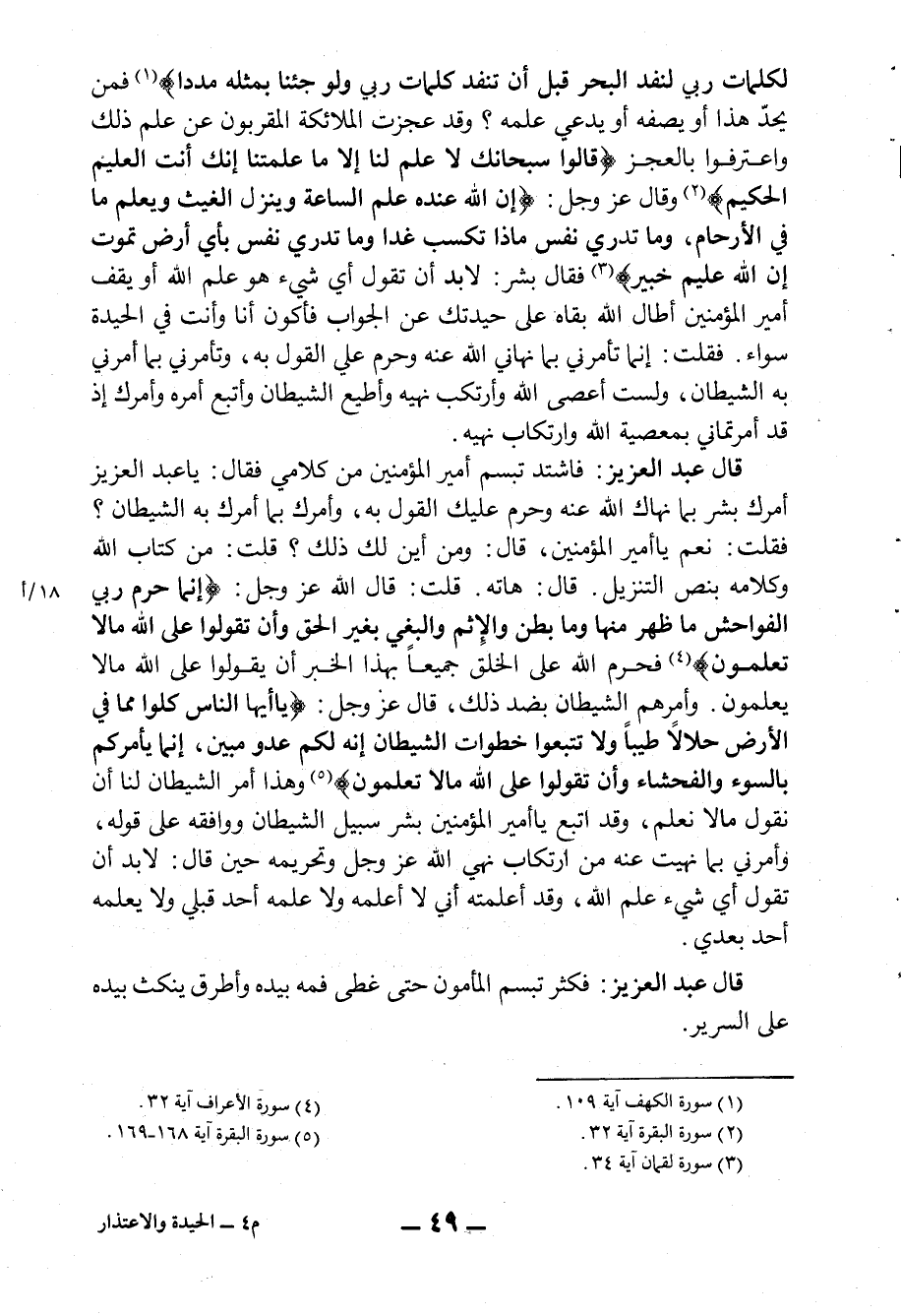 لِكَلِمَاتِ رَبِّي لَنَفِدَ الْبَحْرُ قَبْلَ أَنْ تَنْفَدَ كَلِمَاتُ رَبِّي وَلَوْ جِئْنَا بِمِثْلِهِ مَدَداً} 1 فمن يحذ هذا أو يصفه أو يدعي علمه؟ وقد عجزت الملائكة المقربون عن علم ذلك واعترفوا بالعجز {قَالُوا سُبْحَانَكَ لا عِلْمَ لَنَا إِلَّا مَا عَلَّمْتَنَا إِنَّكَ أَنْتَ الْعَلِيمُ الْحَكِيمُْ} 2 وقال عز وجل: {إِنَّ اللَّهَ عِنْدَهُ عِلْمُ السَّاعَةِ وَيُنَزِّلُ الْغَيْثَ وَيَعْلَمُ مَا فِي الأَرْحَامِ وَمَا تَدْرِي نَفْسٌ مَاذَا تَكْسِبُ غَداً وَمَا تَدْرِي نَفْسٌ بِأَيِّ أَرْضٍ تَمُوتُ إِنَّ اللَّهَ عَلِيمٌ خَبِيرٌ} 3 فقال بشر: لابد أن تقول أي شيء هو علم الله أو يقف أمير المؤمنين أطال الله بقاه على حيدتك عن الجواب فأكون أنا وأنت يا الحيدة سواء. فقلت: إنما تأمرني بما نهاني الله عنه وحرم علي القول به، وتأمرني بما أمرني به الشيطان، ولست أعصى الله وأرتكب نهيه وأطيع الشيطان وأتبع أمره وأمرك إذ قد أمرتماني بمعصية الله وارتكاب نهيه.