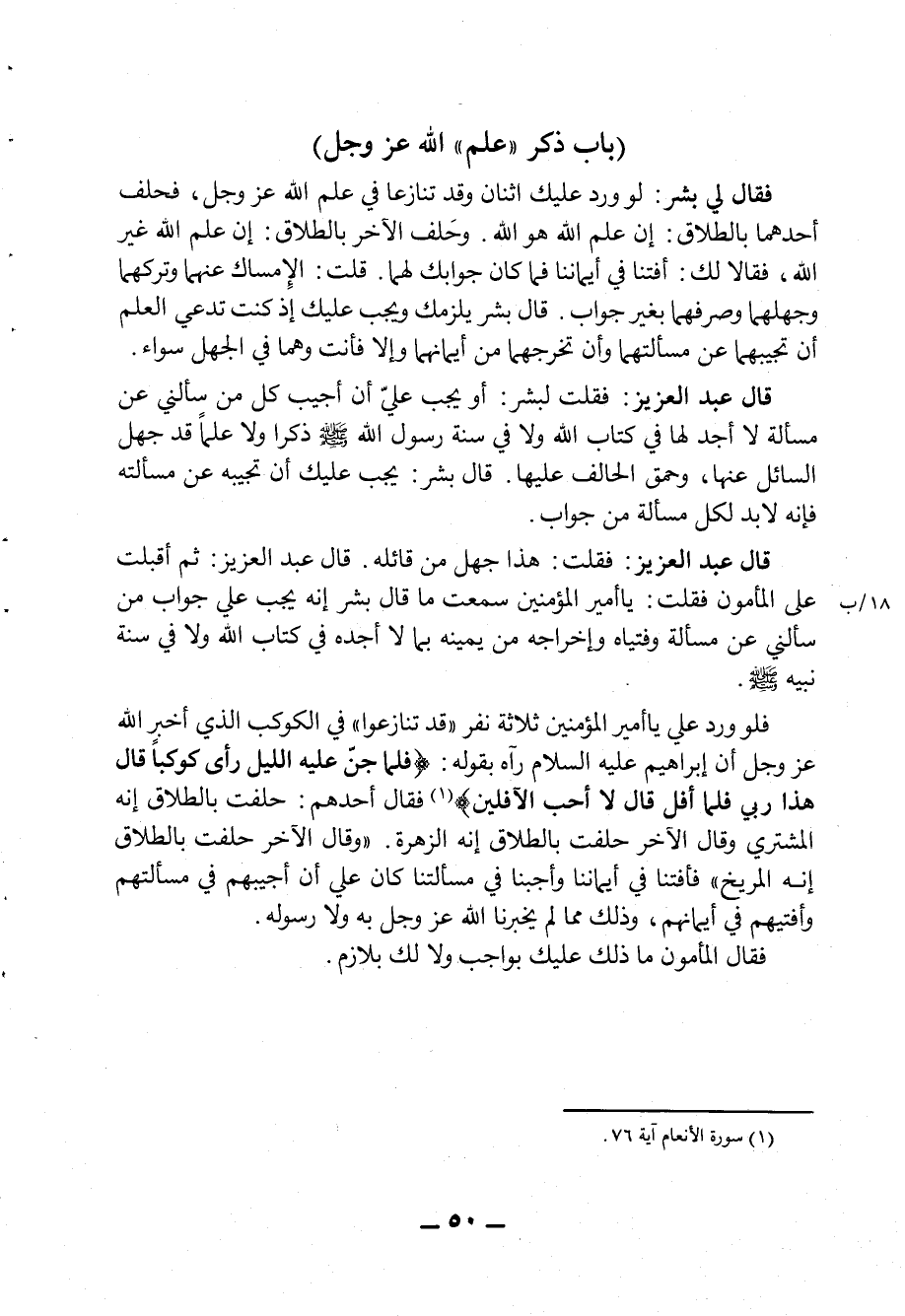 فقال لي بشر: "لو ورد عليك اثنان وقد تنازعا في علم الله عز وجل، فحلف أحد هما بالطلاق: إن علم الله هو الله. وخلف الآخر بالطلاق: إن علم الله غير الله، فقالا لك: أفتنا في أيماننا فما كان جوابك لهما. قلت: الإمساك عنهما وتركهما وجهلهما وصرفهما بغير جواب. قال بشر يلزمك ويجب عليك إذ كنت تدعي العلم أن تجيبهما عن مسألتهما وأن تخرجهما من أيمانهما وإلاّ فأنت وهما في الجهل سواء. قال عبد العزيز: فقلت لبشرة أو يجب علي أن أجيب كل من سألني عن مسألة لا أجد لها في كتاب الله ولا في سنة رسول الله صلى الله عليه وسلم ذكرا ولا علما قد جهل السائل عنها، وحمق الحالف عليها. قال بشر: يجب عليك أن تجيبه عن مسألته فإنه لابد لكل مسألة من جواب".