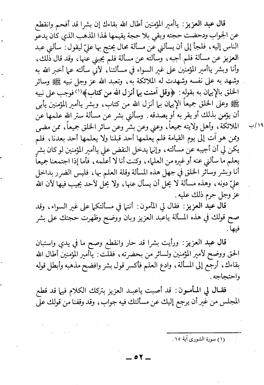 قال عبد العزيز: يا أمير المؤمنين أطال الله بقاءك إن بشرا قد أفحم وانقطع عن الجواب ودحضت حجته وبقي بلا حجة يقيمها هذا المذهب الذي كان يدعو الناس إليه، فلجأ إلى أن يسألني عن مسألة محال يحتج بها في ليقول: سألني عبد العزيز عن مسألة فلم أجبه، وسألته عن مسألة فلم يجبني عنها، وقد قال ذلك، وأنا وبشر يا أمير المؤمنين على غير السواء في مسألتنا، لأني سألته عما أخبر الله به وشهد به على نفسه وشهدت له الملائكة به، وتعبد الله عز وجل نبيه صلى الله عليه وسلم وسائر الخلق بالإيمان به بقوله: {وَقُلْ آمَنْتُ بِمَا أَنْزَلَ اللَّهُ مِنْ كِتَاب} 1 فوجب على نبيه صلى الله عليه وسلم وعلى الخلق جميعا الإيمان بما أنزل الله من كتاب، وبشر يا أمير المؤمنين يأبى أن يؤمن بذلك أو يقر به أو يصدقه. وسألني بشر عن مسألة ستر الله علمها عن الملائكة، وأهل ولايته جميعا، وعني وعن بشر وعن سائر الخلق جميعا، ممن مضى وممن هو آت إلى يوم القيامة فلم يعلمها أحد قبلنا ولا يعلمها أحد بعدنا، فلم يكن لي أن أجيبه عن مسألته، وإنما يدخل النقض علي يا أمير المؤمنين لو كان بشر يعلم ما سألني عنه أو غيره من العلماء، وكنت أنا لا أعلمه، فأما إذا اجتمعنا جميعا أنا وبشر وسائر الخلق في جهل هذه المسألة وقلة العلم بها، فليس الضرر بداخل في دونه، وهذه مسألة لا يحل أن يسأل عنها، ولا يحل لأحد يجيب فيها لأن الله عز وجل حرم ذلك عليه.