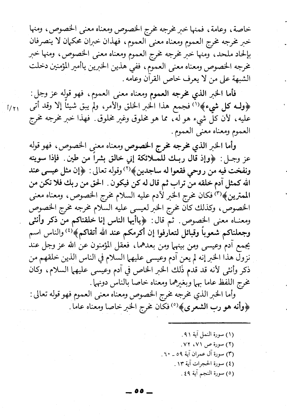 وأما الخبر الذي مخرجه مخرج الخصوص ومعناه معني الخصوص، فهو قوله عز وجل: {إِذْ قَالَ رَبُّكَ لِلْمَلائِكَةِ إِنِّي خَالِقٌ بَشَراً مِنْ طِينٍ. فَإِذَا سَوَّيْتُهُ وَنَفَخْتُ فِيهِ مِنْ رُوحِي فَقَعُوا لَهُ سَاجِدِينَ} 2 وقوله تعالى: {إِنَّ مَثَلَ عِيسَى عِنْدَ اللَّهِ كَمَثَلِ آدَمَ خَلَقَهُ مِنْ تُرَابٍ ثُمَّ قَالَ لَهُ كُنْ فَيَكُونُ الْحَقُّ مِنْ رَبِّكَ فَلا تَكُنْ مِنَ الْمُمْتَرِينَ} 3 فكان مخرج الخبر لآدم عليه السلام مخرج الخصوص، ومعناه معنى الخصوص، وكذلك كان مخرج الخبر لعيسى عليه السلام مخرجه مخرج الخصوص ومعناه معنى الخصوص. ثم قال: {يَا أَيُّهَا النَّاسُ إِنَّا خَلَقْنَاكُمْ مِنْ ذَكَرٍ وَأُنْثَى وَجَعَلْنَاكُمْ شُعُوباً وَقَبَائِلَ لِتَعَارَفُوا إِنَّ أَكْرَمَكُمْ عِنْدَ اللَّهِ أَتْقَاكُمْ} 4 والناس اسم يجمع آدم وعيسى ومن بينهما ومن بعد هما، فعقل المؤمنون عن الله عز وجل عند نزول هذا الخبر إنه لم يعن آدم وعيسى عليهما السلام في الناس الذين خلقهم من ذكر وأنثى لأنه قد قدم ذلك الخبر الخاص في آدم وعيسى عليهما السلام، وكان مخرج اللفظ عاما بهما وبغير هما ومعناه خاصا بالناس دونهما.