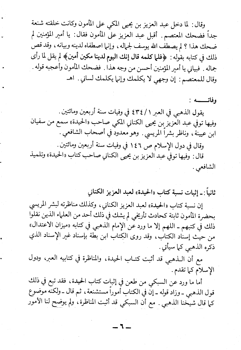 قال: "وفيها توفي عبد العزيز بن يحي الكناني صاحب كتاب "الحيدة" وتلميذ الشافعي".