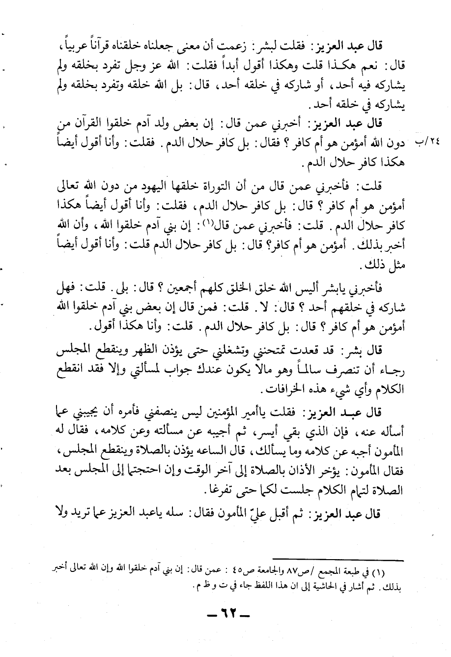 قال عبد العزيز: "أخبرني عمن قال: إن بعض ولد آدم خلقوا القرآن من دون الله أمؤمن هو أم كافر؟ فقال: بل كافر حلال الدم. فقلت: وأنا أقول أيضا هكذا كافر حلال الدم.