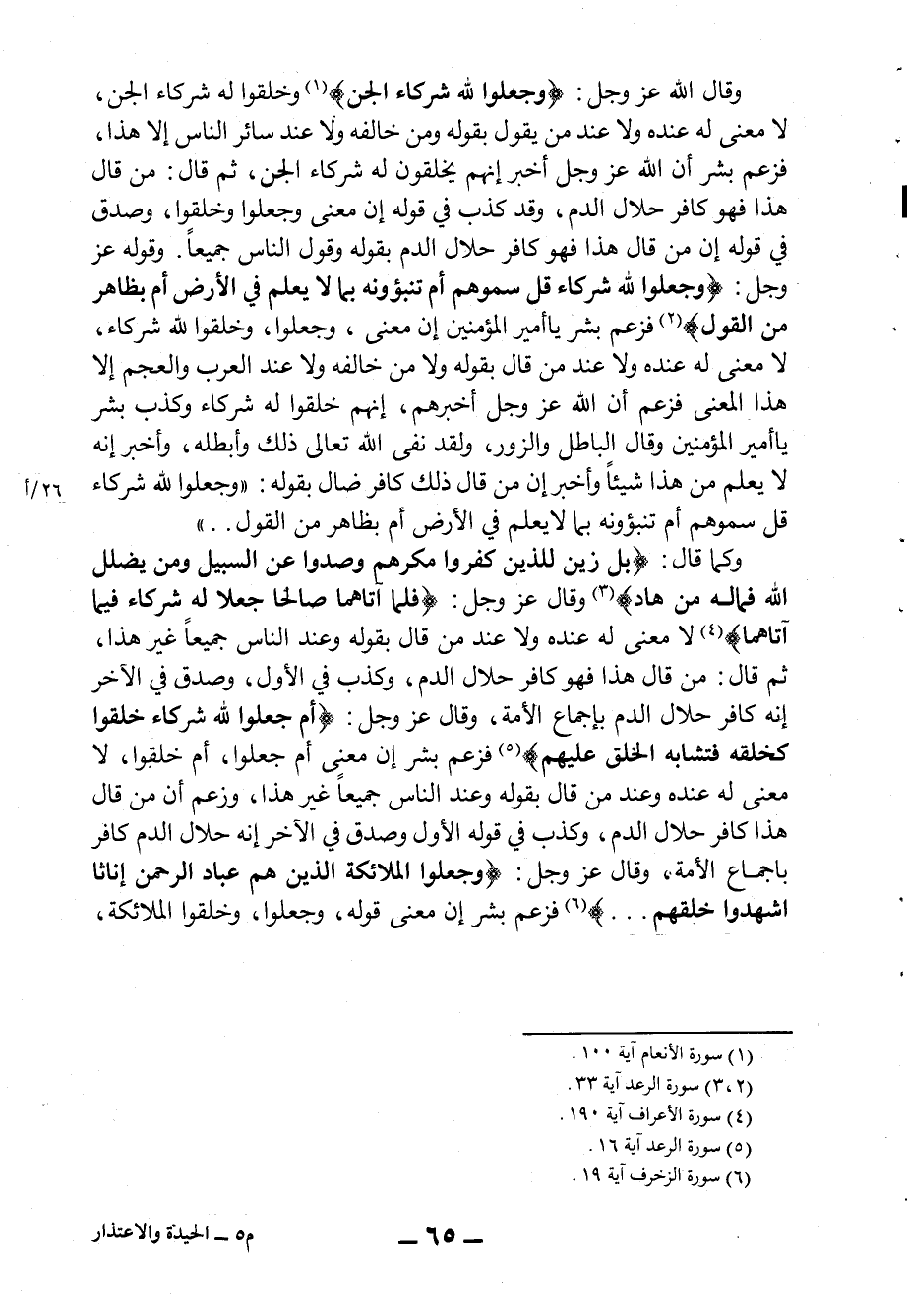 وكما قال: {بَلْ زُيِّنَ لِلَّذِينَ كَفَرُوا مَكْرُهُمْ وَصُدُّوا عَنِ السَّبِيلِ وَمَنْ يُضْلِلِ اللَّهُ فَمَا لَهُ مِنْ هَادٍ} 3 وقال عز وجل: {فَلَمَّا آتَاهُمَا صَالِحاً جَعَلا لَهُ شُرَكَاءَ فِيمَا آتَاهُمَا} 4 لا معنى له عنده ولا عند من قال بقوله وعند الناس جميعا غير هذا، ثم قال: من قال هذا فهو كافر حلال الدم، وكذب في الأول، وصدق في الآخر إنه كافر حلال الدم بإجماع الأمة، وقال عز وجل: {أَمْ جَعَلُوا لِلَّهِ شُرَكَاءَ خَلَقُوا كَخَلْقِهِ فَتَشَابَهَ الْخَلْقُ عَلَيْهِمْ} 5 فزعم بشر إن معنى أم جعلوا، أم خلقوا، لا معنى له عنده وعند من قال بقوله وعند الناس جميعا غير هذا، وزعم أن من قال هذا كافر حلال الدم، وكذب في قوله الأول وصدق في الآخر إنه حلال الدم كافر بإجماع الأمة.، وقال عز وجل: {وَجَعَلُوا الْمَلائِكَةَ الَّذِينَ هُمْ عِبَادُ الرَّحْمَنِ إِنَاثاً أَشَهِدُوا خَلْقَهُمْ ... } 6 فزعم بشر إن معنى قوله، وجعلوا، وخلقوا الملائكة،