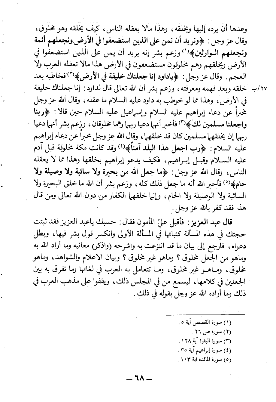 وعدها أن يرده إليها ويخلقه، وهذا مالا يعقله الناس، كيف يخلقه وهو مخلوق، وقال عز وجل: {وَنُرِيدُ أَنْ نَمُنَّ عَلَى الَّذِينَ اسْتُضْعِفُوا فِي الْأَرْضِ وَنَجْعَلَهُمْ أَئِمَّةً وَنَجْعَلَهُمُ الْوَارِثِينَ} 1 وزعم بشر إنه يريد أن يمن على الذين استضعفوا في الأرض ويخلقهم وهم مخلوقون مستضعفون في الأرض هذا مالا تعقله العرب ولا العجم. وقال عز وجل: {يَا دَاوُدُ إِنَّا جَعَلْنَاكَ خَلِيفَةً فِي الأَرْضِ} 2 فخاطبه بعد خلقه وبعد فهمه ومعرفته، وزعم بشر أن الله تعالى قال لداود: إنا جعلناك خليفة في الأرض، وهذا مما لو خوطب به داود عليه السلام ما عقله، وقال الله عزوجل مخبرا عن دعاء إبراهيم عليه السلام وإسماعيل عليه السلام حين قالا: {رَبَّنَا وَاجْعَلْنَا مُسْلِمَيْنِ لَكَ} 3 فأخبر أنهما دعيا ربهما وهما مخلوقان، وزعم بشر أنهما دعيا ربهما إن يخلقهما مسلمين كان قد خلقهما، وقال الله عزوجل مخبرا عن دعاء إبراهيم عليه السلام: {وَإِذْ قَالَ إِبْرَاهِيمُ رَبِّ اجْعَلْ هَذَا الْبَلَدَ آمِناً} 4 وقد كانت مكة مخلوقة قبل آدم عليه السلام وقبل إبراهيم، فكيف يدعو إبراهيم بخلقها وهذا مما لا يعقله الناس، وقال الله عز وجل: {مَا جَعَلَ اللَّهُ مِنْ بَحِيرَةٍ وَلا سَائِبَةٍ وَلا وَصِيلَةٍ وَلا حَامٍ} 5 فأخبر الله أنه ما جعل ذلك كله، وزعم بشر أن الله ما خلق البحيرة ولا السائبة ولا الوصيلة ولا الحام، وإنما خلقهما الكفار من دون الله تعالى ومن قال هذا فقد كفر بالله عزوجل".