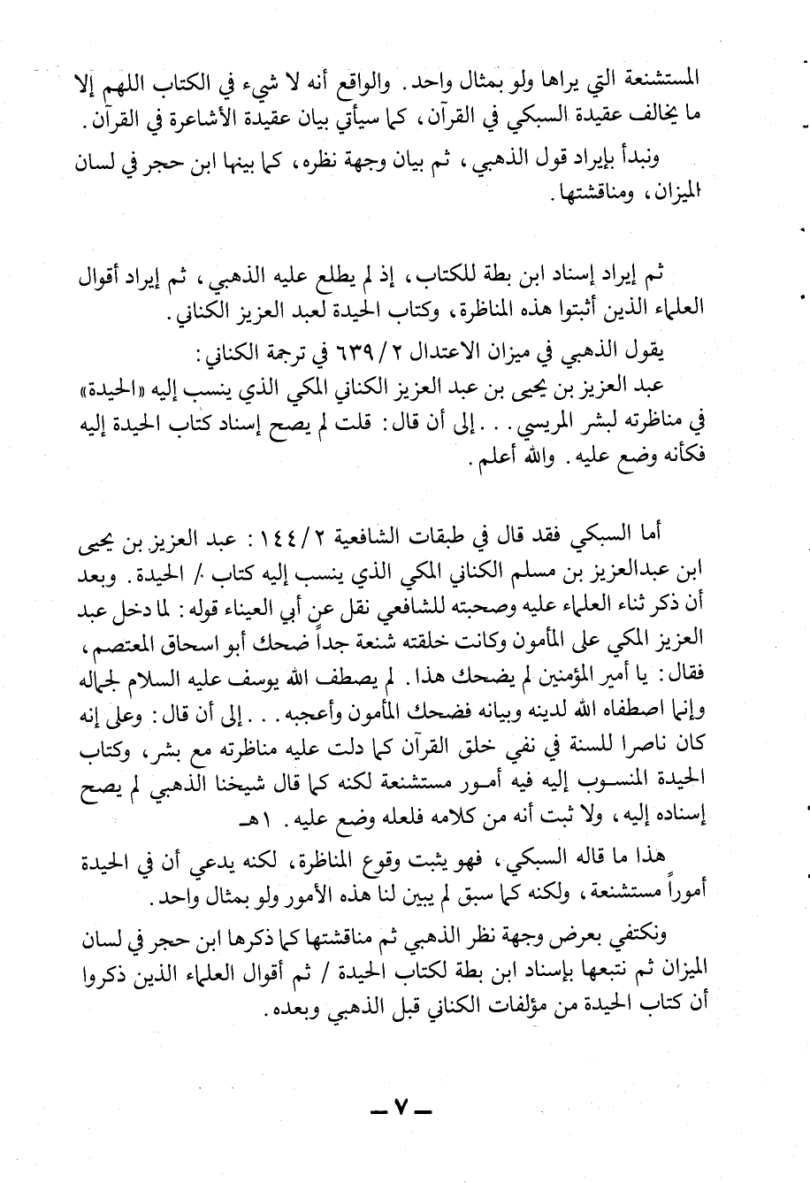 أما السبكي فقد قال في طبقات الشافعية 144/2: عبد العزيز بن يحي ابن عبد العزيز بن مسلم الكناني المكي الذي ينسب إليه كتاب بر الحيدة. وبعد أن ذكر ثناء العلماء عليه وصحبته للشافعي نقل عين أبي العيناء قوله: "لما دخل عبد العزيز المكي على المأمون وكانت خلقته شنعة جدا ضحك أبو إسحاق المعتصم"، فقال: "يا أمير المؤمنين أيضحك هذا لم يصطف الله يوسف عليه السلام لجماله وإنما اصطفاه الله لدينه وبيانه فضحك المأمون وأعجبه ... إلى أن قال: وعلى إنه كان ناصرا للسنة في نفي خلق القرآن كما دلت عليه مناظرته مع بشر"، وكتاب الحيدة المنسوب إليه فيه أمور مستشنعة لكنه كما قال شيخنا الذهبي "لم يصح إسناده إليه"، ولا ثبت أنه من كلامه فلعله وضع عليه اهـ