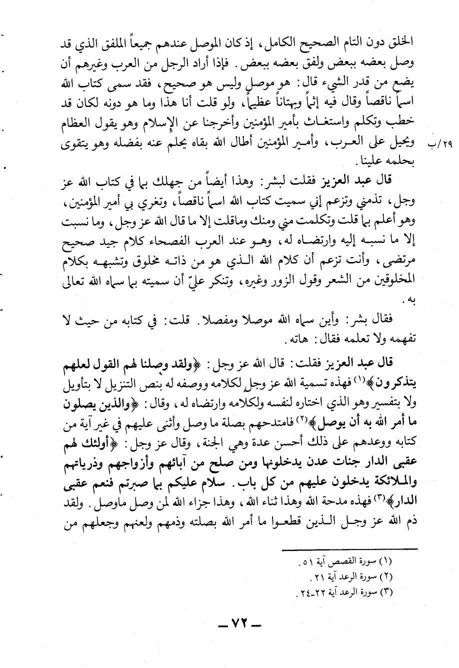 قال عبد العزيز فقلت: "قال الله عز وجل: {وَلَقَدْ وَصَّلْنَا لَهُمُ الْقَوْلَ لَعَلَّهُمْ يَتَذَكَّرُونَ} 1فهذه تسمية الله عز وجل لكلامه ووصفه له بنص التنزيل لا بتأويل ولا بتفسير وهو الذي اختاره لنفسه ولكلامه وارتضاه له، وقال: {وَالَّذِينَ يَصِلُونَ مَا أَمَرَ اللَّهُ بِهِ أَنْ يُوصَلَ} 2 فامتدحهم بصلة ما وصل وأثنى عليهم في غير آية من كتابه ووعدهم على ذلك أحسن عدة وهي الجنة، وقالت عز وجل: {أُولَئِكَ لَهُمْ عُقْبَى الدَّارِ جَنَّاتُ عَدْنٍ يَدْخُلُونَهَا وَمَنْ صَلَحَ مِنْ آبَائِهِمْ وَأَزْوَاجِهِمْ وَذُرِّيَّاتِهِمْ وَالْمَلائِكَةُ يَدْخُلُونَ عَلَيْهِمْ مِنْ كُلِّ بَابٍ. سَلامٌ عَلَيْكُمْ بِمَا صَبَرْتُمْ فَنِعْمَ عُقْبَى الدَّارِ} 3 فهذه مدحة الله وهذا ثناء الله، وهذا جزاء الله لمن وصل ما وصل. ولقد ذم الله عز وجل الذين قطعوا ما أمر الله بصلته وذمهم ولعنهم وجعلهم من