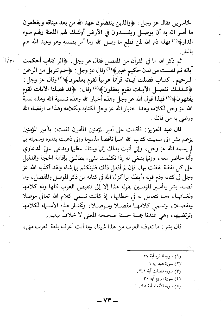 الخاسرين فقال عز وجل: {وَالَّذِينَ يَنْقُضُونَ عَهْدَ اللَّهِ مِنْ بَعْدِ مِيثَاقِهِ وَيَقْطَعُونَ مَا أَمَرَ اللَّهُ بِهِ أَنْ يُوصَلَ وَيُفْسِدُونَ فِي الأَرْضِ أُولَئِكَ لَهُمُ اللَّعْنَةُ وَلَهُمْ سُوءُ الدَّارِ} 1 فهذا ذم الله لمن قطع ما وصل الله وما أمر بصلته وهو وعيد الله لهم بالنار.، ثم ذكر الله ما في القرآن من المفصل فقال عز وجل: {الر كِتَابٌ أُحْكِمَتْ آيَاتُهُ ثُمَّ فُصِّلَتْ مِنْ لَدُنْ حَكِيمٍ خَبِيرٍ} 2 وقال عزوجل: {حم تَنْزِيلٌ مِنَ الرَّحْمَنِ الرَّحِيمِ كِتَابٌ فُصِّلَتْ آيَاتُهُ قُرْآناً عَرَبِيّاً لِقَوْمٍ يَعْلَمُونَ} 3 وقال عز وجل: {كَذَلِكَ نُفَصِّلُ الآياتِ لِقَوْمٍ يَعْقِلُونَ} 4 وقال: {قَدْ فَصَّلْنَا الآياتِ لِقَوْمٍ يَفْقَهُونَ} 5 فهذا قول الله عز وجل وهذه أخبار الله وهذه تسمية الله وهذه نسبة الله عز وجل لكلامه وهذا اختيار الله عز وجل لكتابه ولكلامه وهذا ما ارتضاه الله ورضي به من قائله".