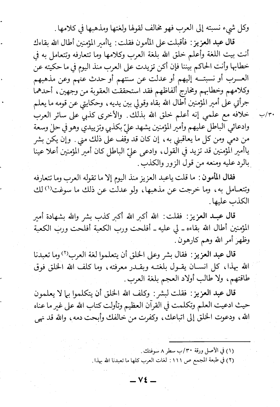 قال عبد العزيز: "فقال بشر وعلى الخلق أن يتعلموا لغة العرب2 وما تعبدنا الله بهذا، كل إنسان يقول بلغته وبقدر معرفته، وما كلف الله الخلق فوق طاقتهم، ولا طالب أولاد العجم بلغة العرب".
