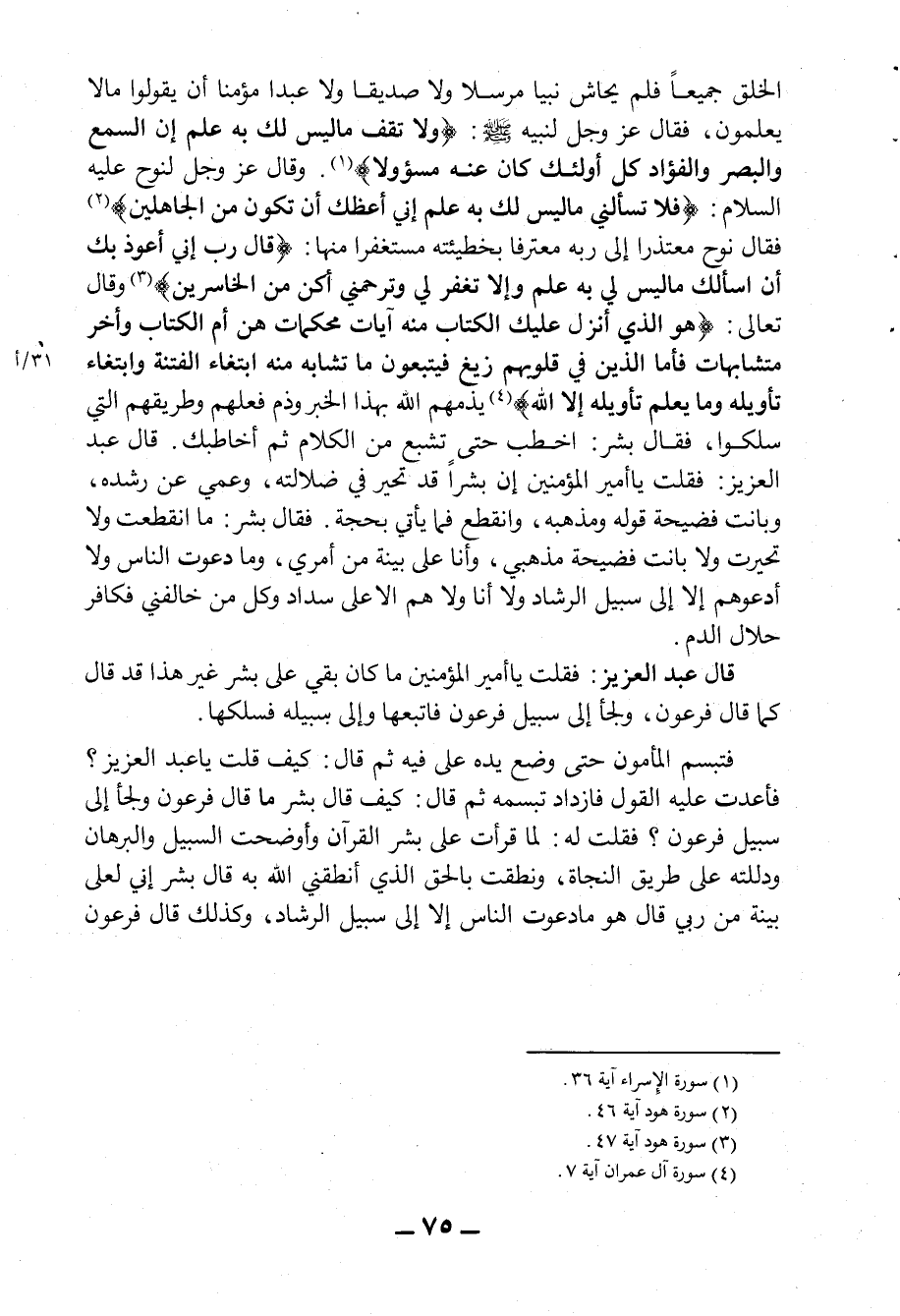 الخلق جميعا فلم يحاش نبيا مرسلا ولا صديقا ولا عبدا مؤمنا أن يقولوا مالا يعلمون، فقال عز وجل لنبيه صلى الله عليه وسلم: {وَلا تَقْفُ مَا لَيْسَ لَكَ بِهِ عِلْمٌ إِنَّ السَّمْعَ وَالْبَصَرَ وَالْفُؤَادَ كُلُّ أُولَئِكَ كَانَ عَنْهُ مَسْؤُولاً} 1 وقال عز وجل لنوح عليه السلام: {فَلا تَسْأَلْنِ مَا لَيْسَ لَكَ بِهِ عِلْمٌ إِنِّي أَعِظُكَ أَنْ تَكُونَ مِنَ الْجَاهِلِينَ} 2 فقال نوح معتذرا إلى ربه معترفا بخطيئته مستغفرا منها: {قَالَ رَبِّ إِنِّي أَعُوذُ بِكَ أَنْ أَسْأَلَكَ مَا لَيْسَ لِي بِهِ عِلْمٌ وَإِلاّ تَغْفِرْ لِي وَتَرْحَمْنِي أَكُنْ مِنَ الْخَاسِرِينَ} 3 وقال تعالى: {هُوَ الَّذِي أَنْزَلَ عَلَيْكَ الْكِتَابَ مِنْهُ آيَاتٌ مُحْكَمَاتٌ هُنَّ أُمُّ الْكِتَابِ وَأُخَرُ مُتَشَابِهَاتٌ فَأَمَّا الَّذِينَ فِي قُلُوبِهِمْ زَيْغٌ فَيَتَّبِعُونَ مَا تَشَابَهَ مِنْهُ ابْتِغَاءَ الْفِتْنَةِ وَابْتِغَاءَ تَأْوِيلِهِ وَمَا يَعْلَمُ تَأْوِيلَهُ إِلاّ اللَّهُ} 4 يذمهم الله بهذا الخبر وذم فعلهم وطريقهم التي سلكوا، فقال بشر: "اخطب حتى تشبع من الكلام ثم أخاطبك". قال عبد العزيز: "فقلت يا أمير المؤمنين إن بشرا قد تحير في ضلالته، وعمي عن رشده، وبانت فضيحة قوله ومذهبه، وانقطع فما يأتي بحجة". فقال بشر: "ما انقطعت ولا تحيرت ولا بانت فضيحة مذهبي، وأنا على بينة من أمري، وما دعوت الناس ولا أدعوهم إلا إلى سبيل الرشاد ولا أنا ولا هم الأعلى سداد وكل من خالفني فكافر حلال الدم".