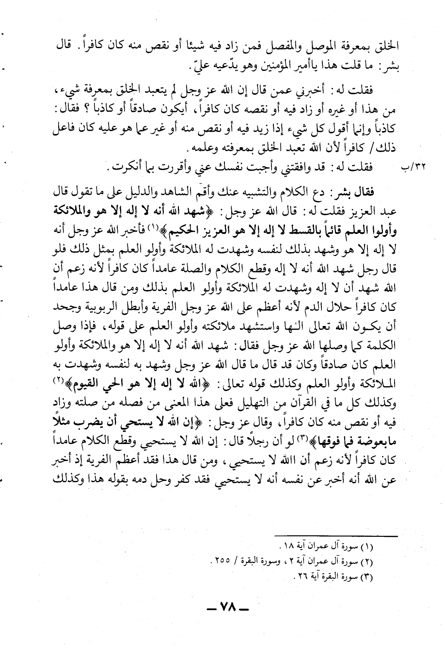 فقلت له: "أخبرني عمن قال إن الله عز وجل لم يتعبد الخلق بمعرفة لشيء، من هذا أو غيره أو زاد فيه أو نقصه كان كافرا، أيكون صادقا أو كاذبا"؟ فقال: "كاذبا وإنما أقول كل شيء إذا زيد فيه أو نقص منه أو غير عما هو عليه كان فاعل ذلك (32/ب) كافرا لأن الله تعبد الخلق، بمعرفته وعلمه".